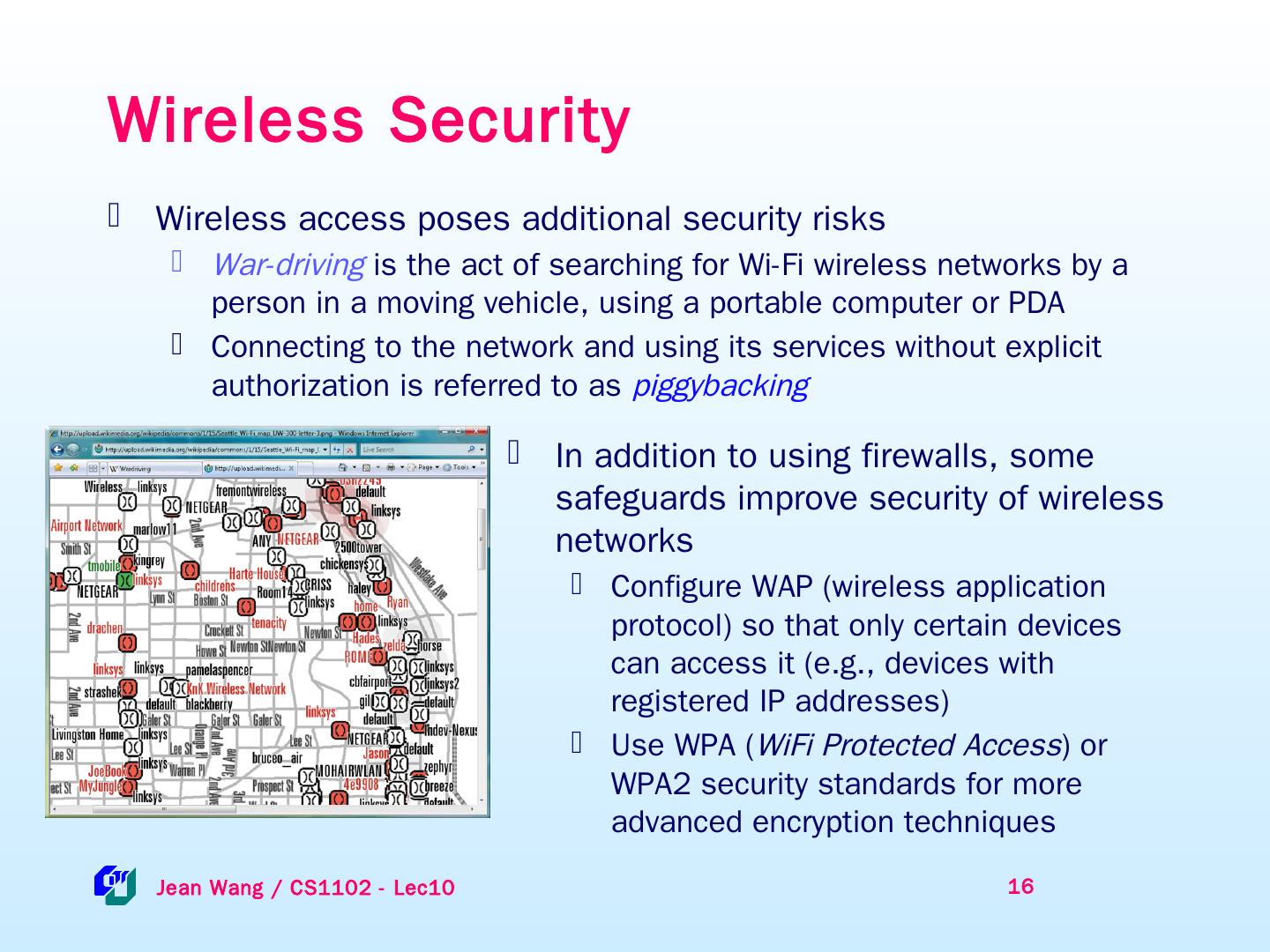 16 .Wireless Security Wireless access poses additional security risks War-driving is the act of searching for Wi-Fi wireless networks by a person in a moving vehicle, using a portable computer or PDA Connecting to the network and using its services without explicit authorization is referred to as piggybacking 16 Jean Wang / CS1102 - Lec10 In addition to using firewalls, some safeguards improve security of wireless networks Configure WAP (wireless application protocol) so that only certain devices can access it (e.g., devices with registered IP addresses) Use WPA ( WiFi Protected Access ) or WPA2 security standards for more advanced encryption techniques
