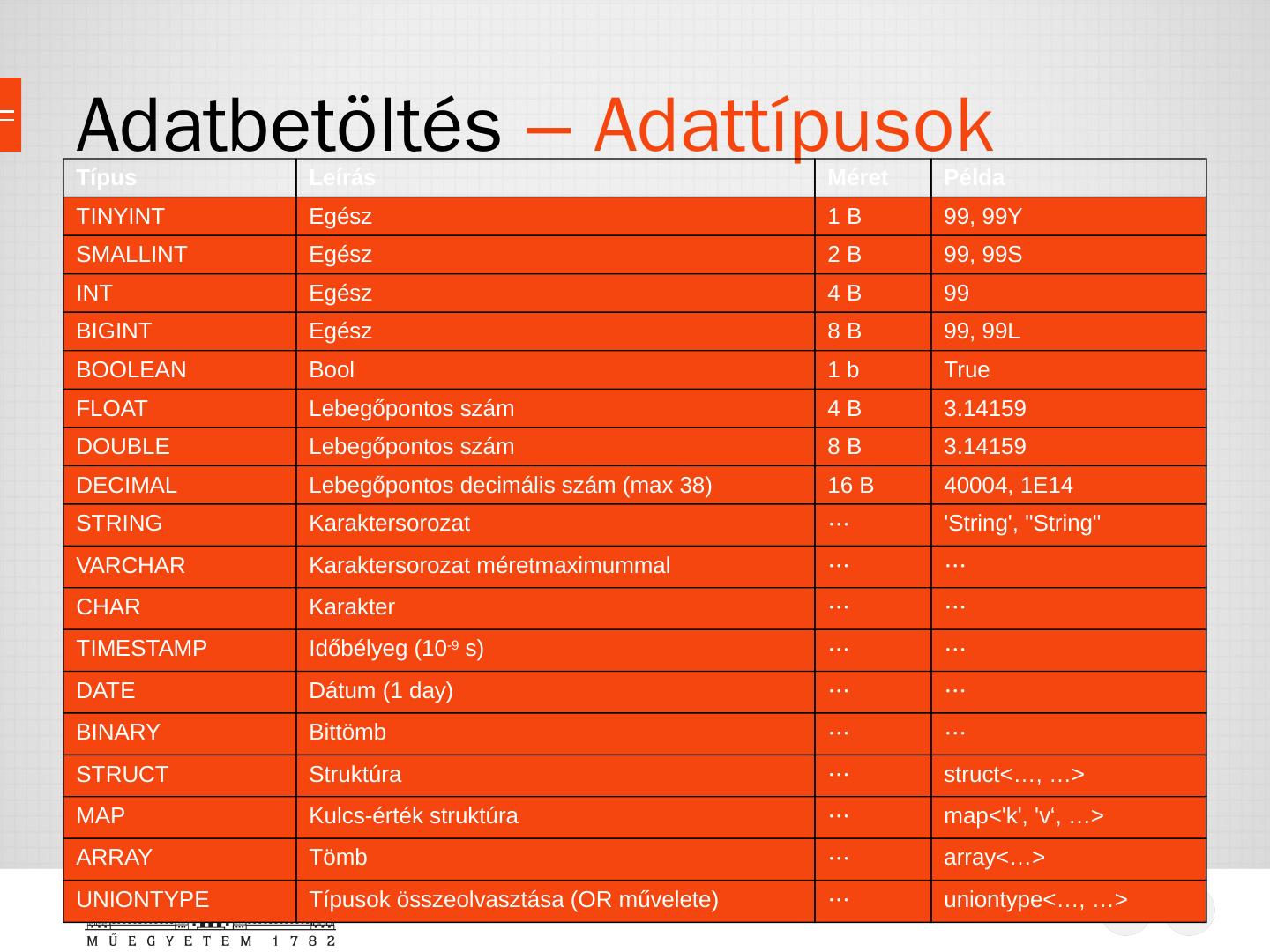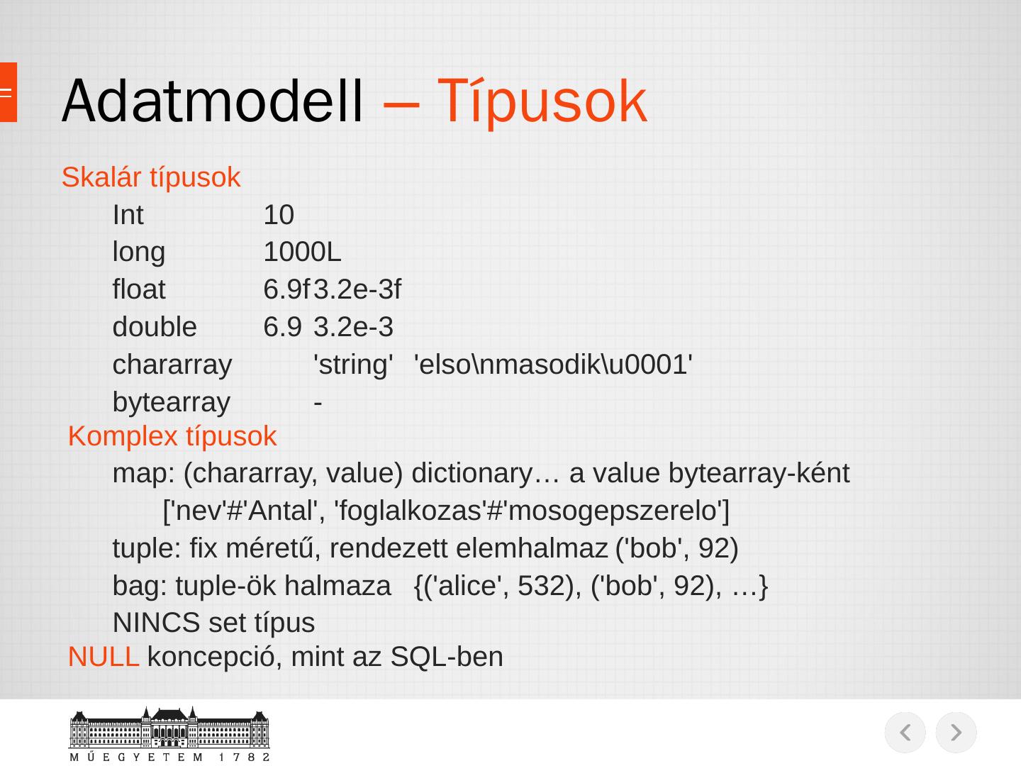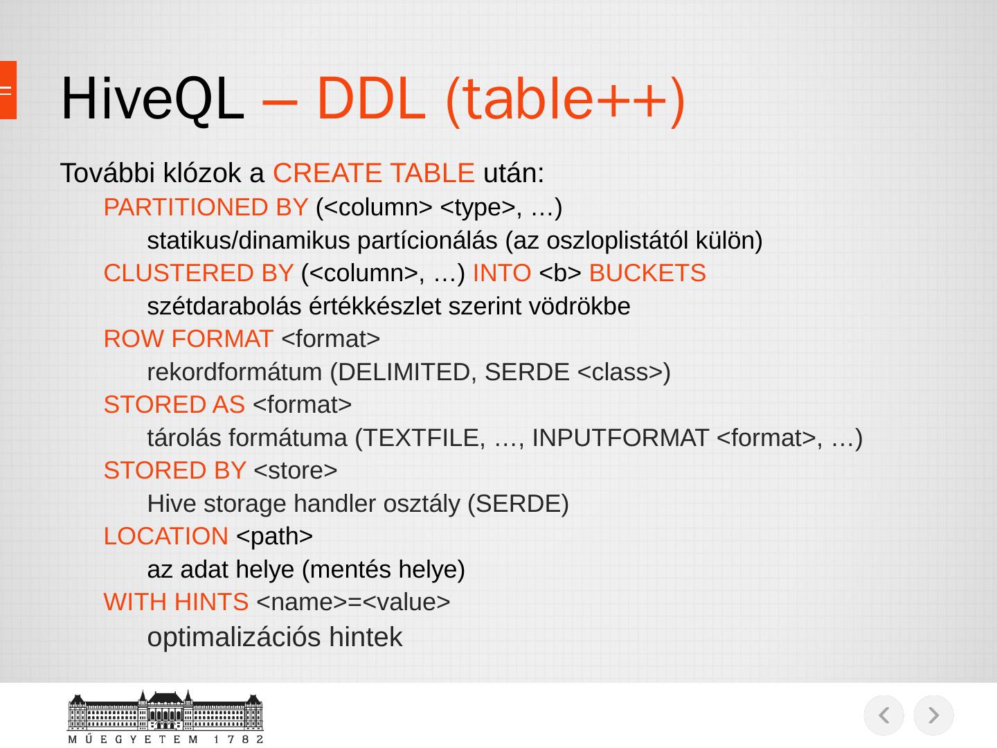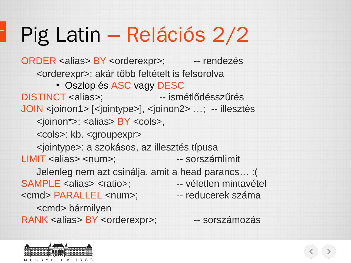 Apache Drill. HiveQL – Változók .... java -cp $PIGDIR/pig.jar org.apache.pig.Main -x local script.pig ... Apache Cassandra integráció. Piglet. Ruby integráció.
