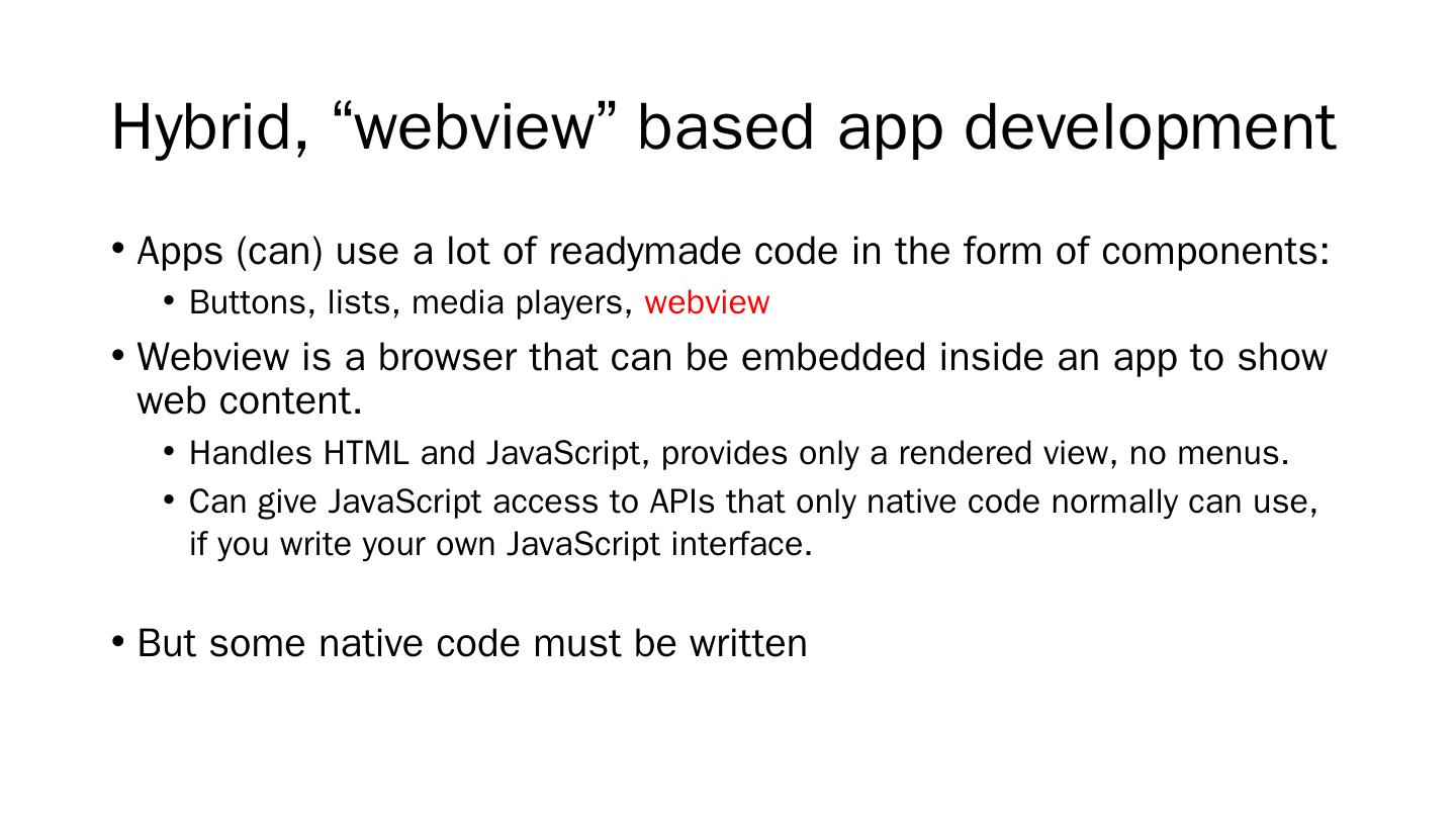 4 .Hybrid, “ webview ” based app development Apps (can) use a lot of readymade code in the form of components: Buttons, lists, media players, webview Webview is a browser that can be embedded inside an app to show web content. Handles HTML and JavaScript, provides only a rendered view, no menus. Can give JavaScript access to APIs that only native code normally can use, if you write your own JavaScript interface. But some native code must be written