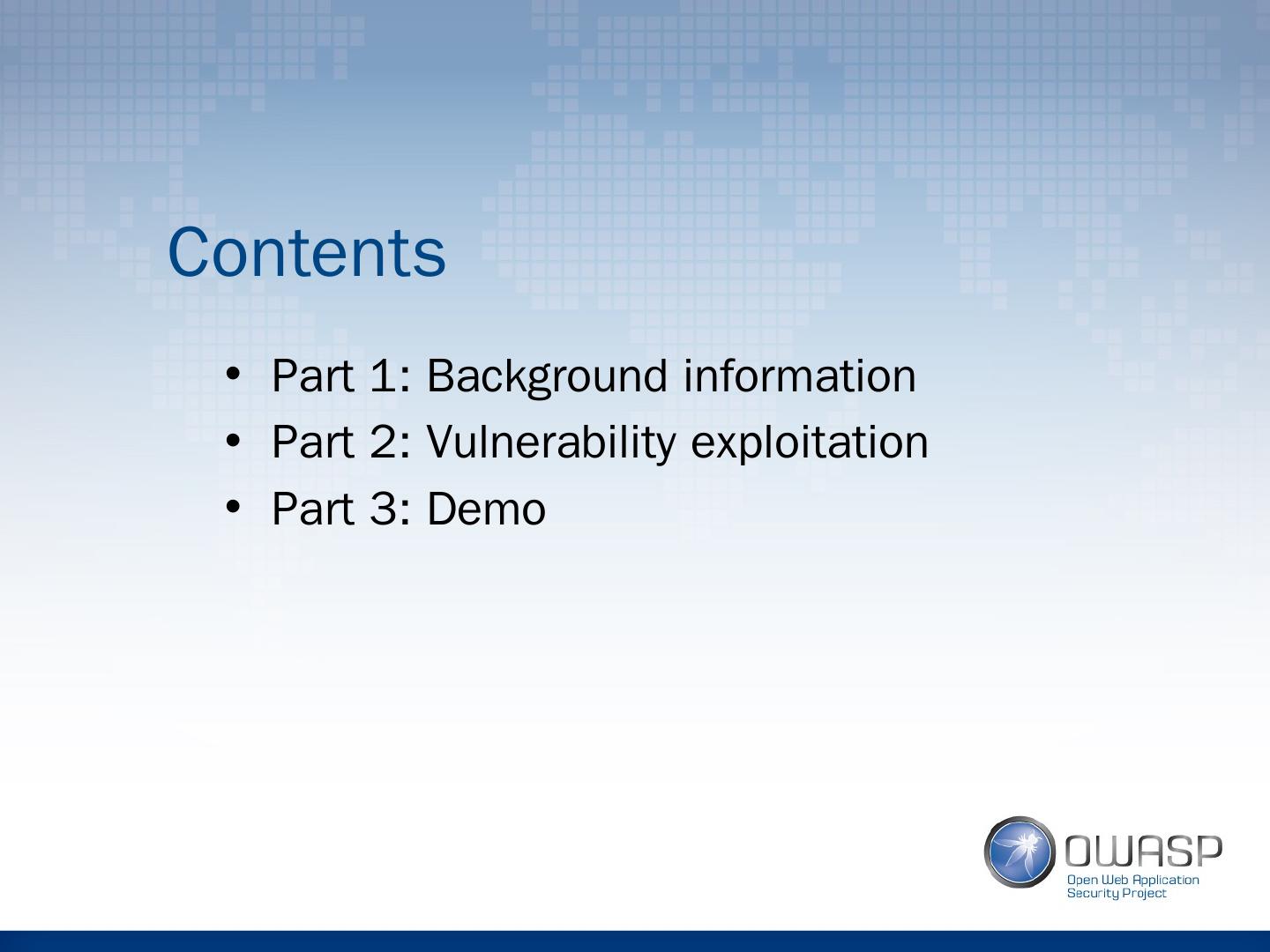 2 .Contents Part 1: Background information Part 2: Vulnerability exploitation Part 3: Demo