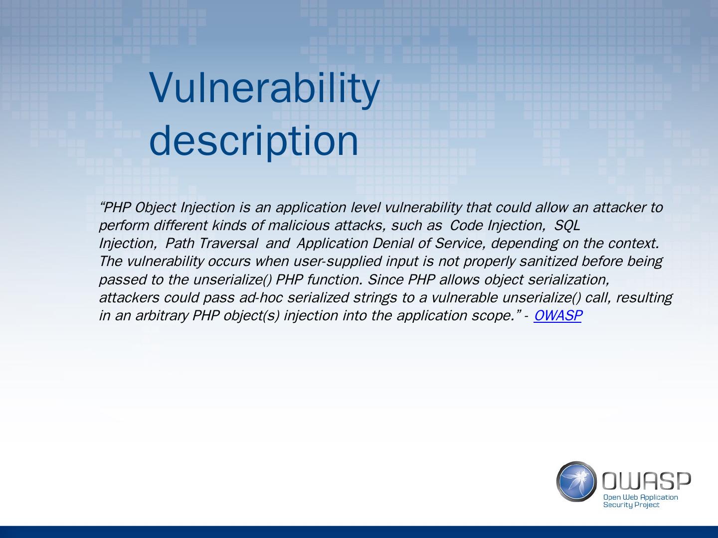 3 .Vulnerability description “ PHP Object Injection is an application level vulnerability that could allow an attacker to perform different kinds of malicious attacks, such as Code Injection, SQL Injection, Path Traversal and Application Denial of Service, depending on the context. The vulnerability occurs when user-supplied input is not properly sanitized before being passed to the unserialize() PHP function. Since PHP allows object serialization, attackers could pass ad-hoc serialized strings to a vulnerable unserialize() call, resulting in an arbitrary PHP object(s) injection into the application scope.” - OWASP