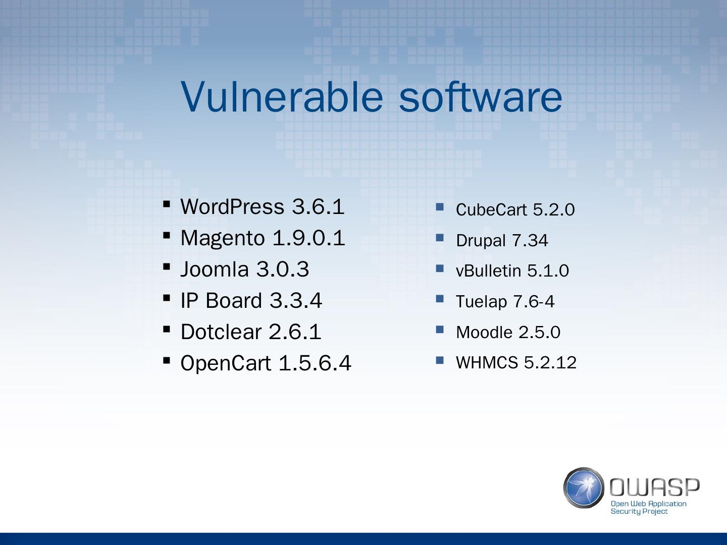 4 .Vulnerable software WordPress 3.6.1 Magento 1.9.0.1 Joomla 3.0.3 IP Board 3.3.4 Dotclear 2.6.1 OpenCart 1.5.6.4 CubeCart 5.2.0 Drupal 7.34 vBulletin 5.1.0 Tuelap 7.6-4 Moodle 2.5.0 WHMCS 5.2.12