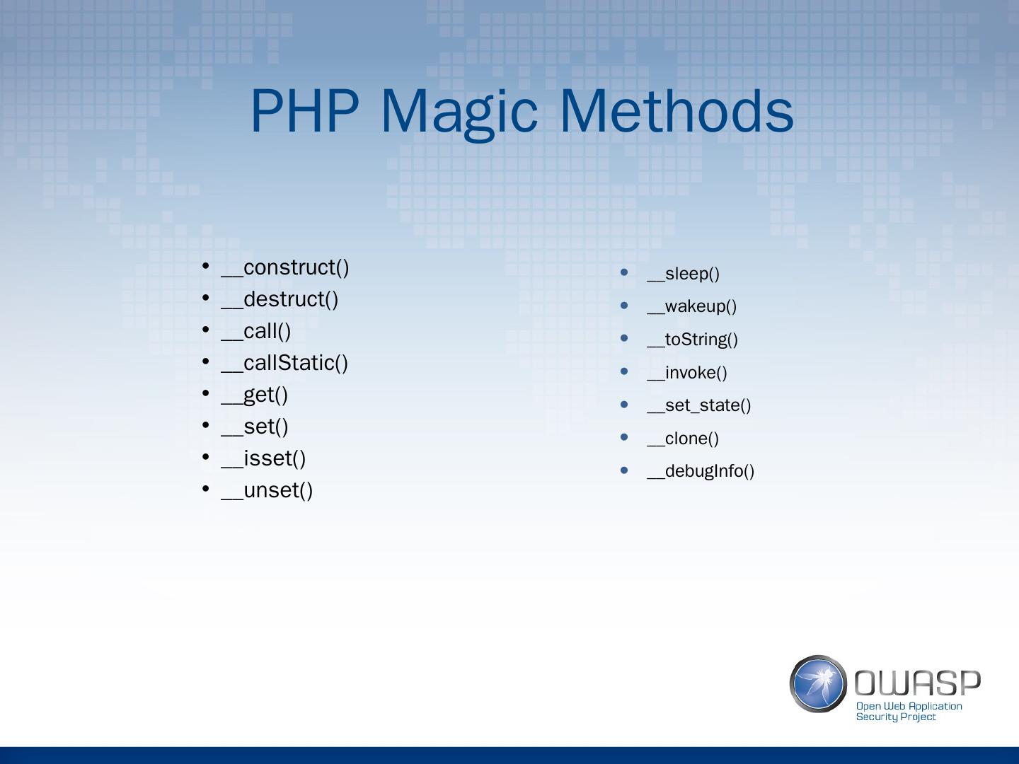 7 .PHP Magic Methods __construct() __destruct() __call() __ callStatic () __get() __set() __ isset () __unset() __sleep() __wakeup() __ toString () __invoke() __ set_state () __clone() __ debugInfo ()