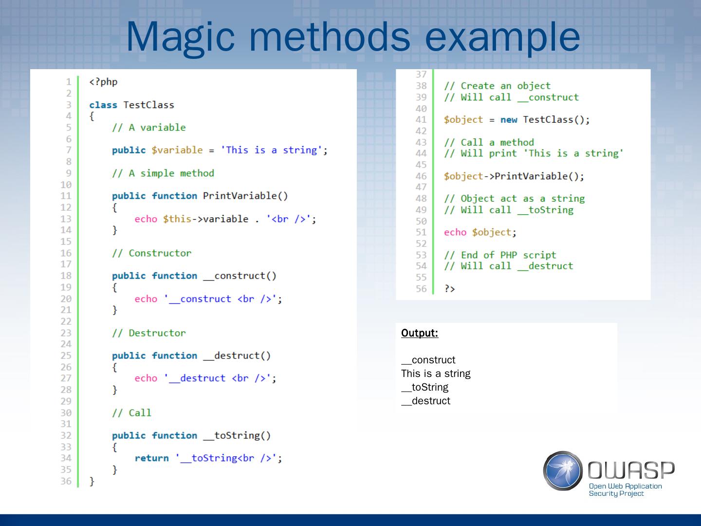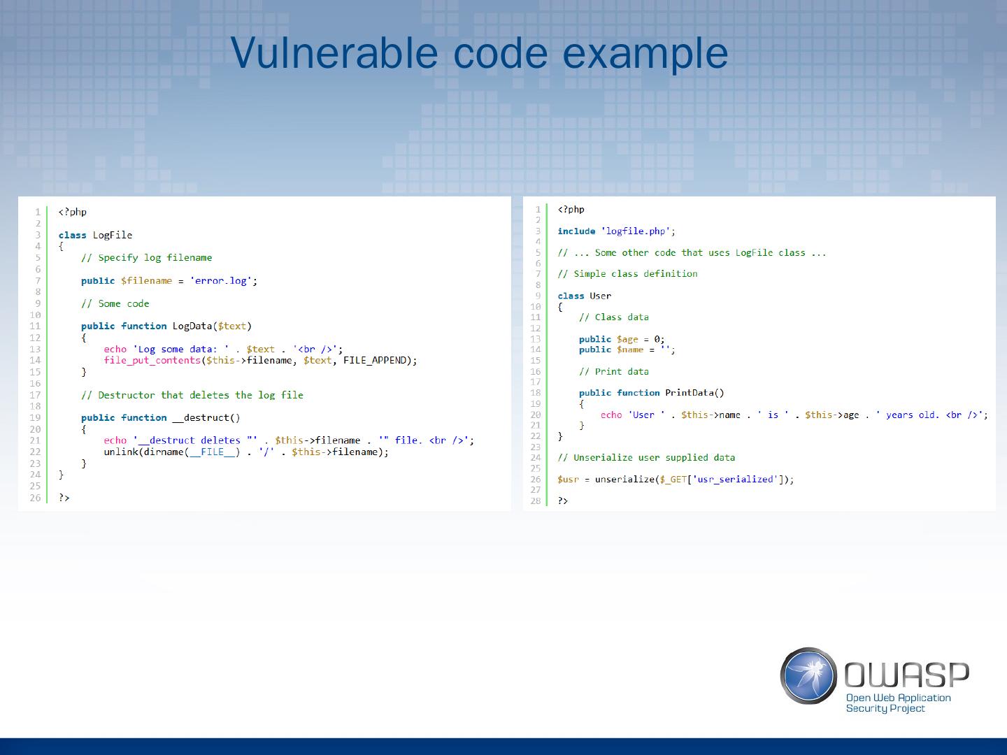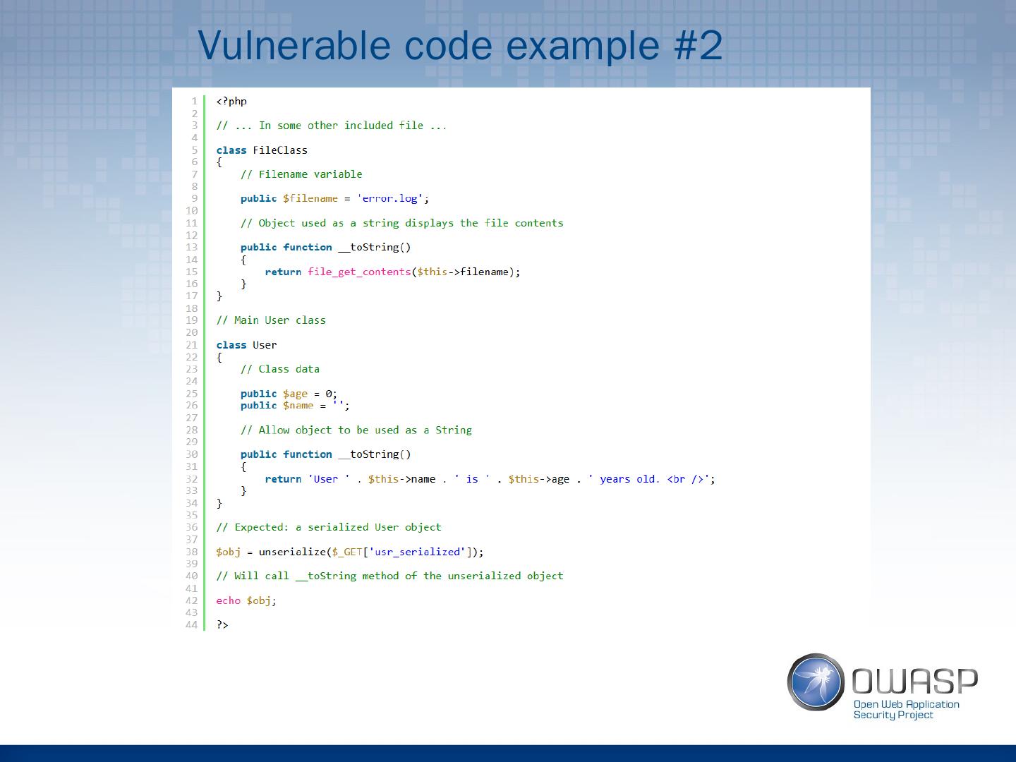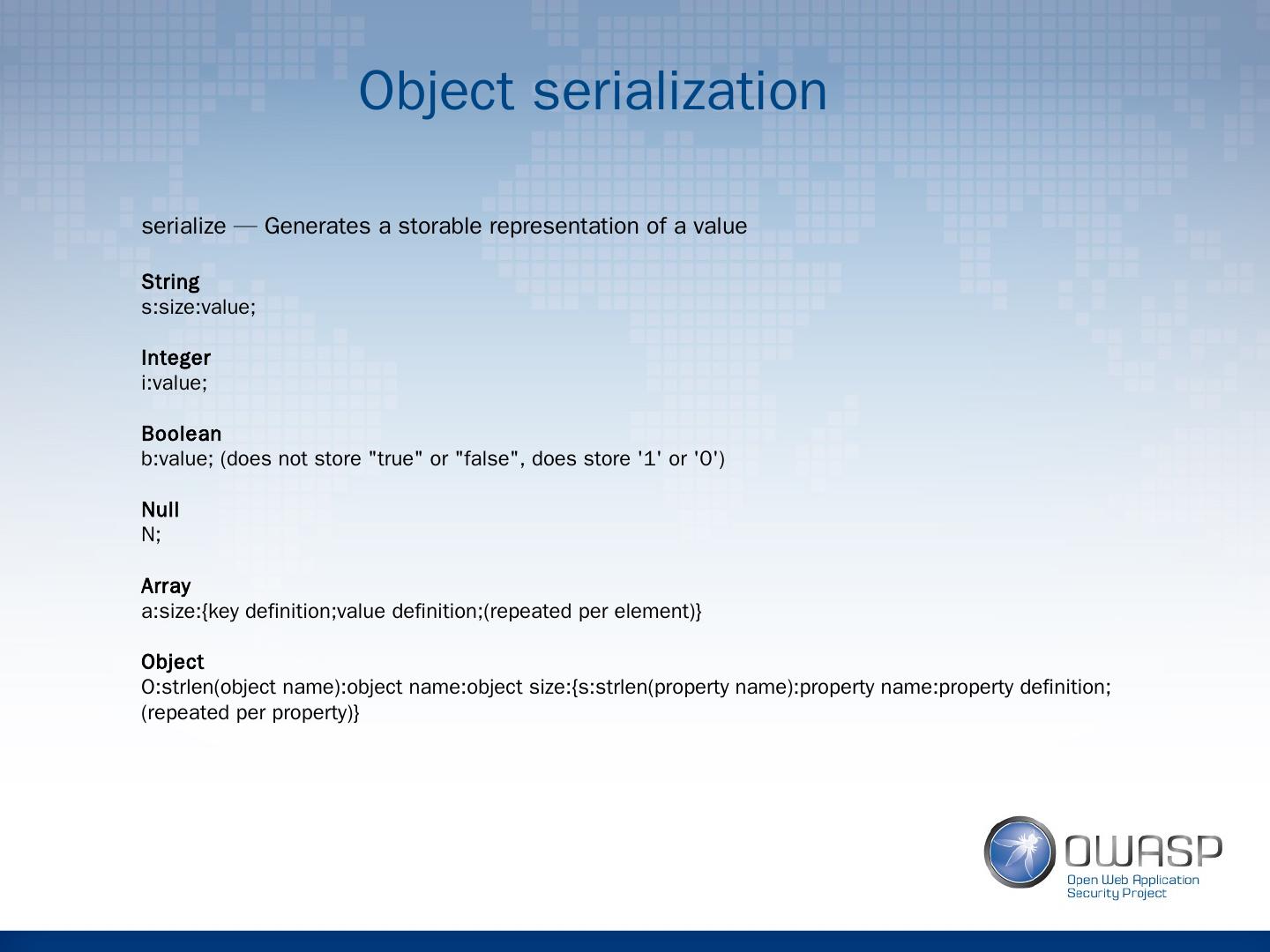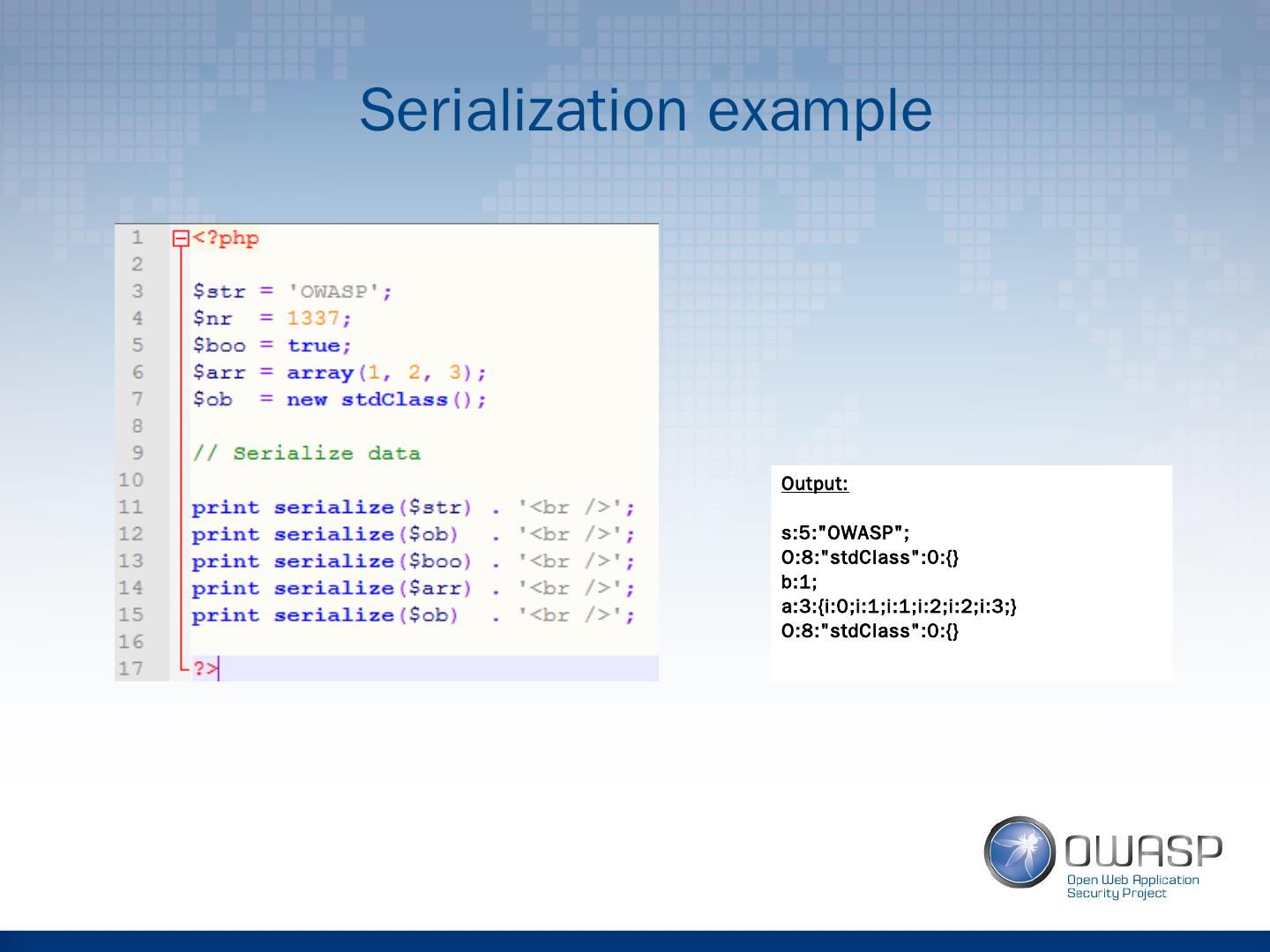 11 .Serialization example Output: s:5:"OWASP"; O:8:"stdClass":0:{} b:1; a:3:{i:0;i:1;i:1;i:2;i:2;i:3;} O:8:"stdClass":0:{}