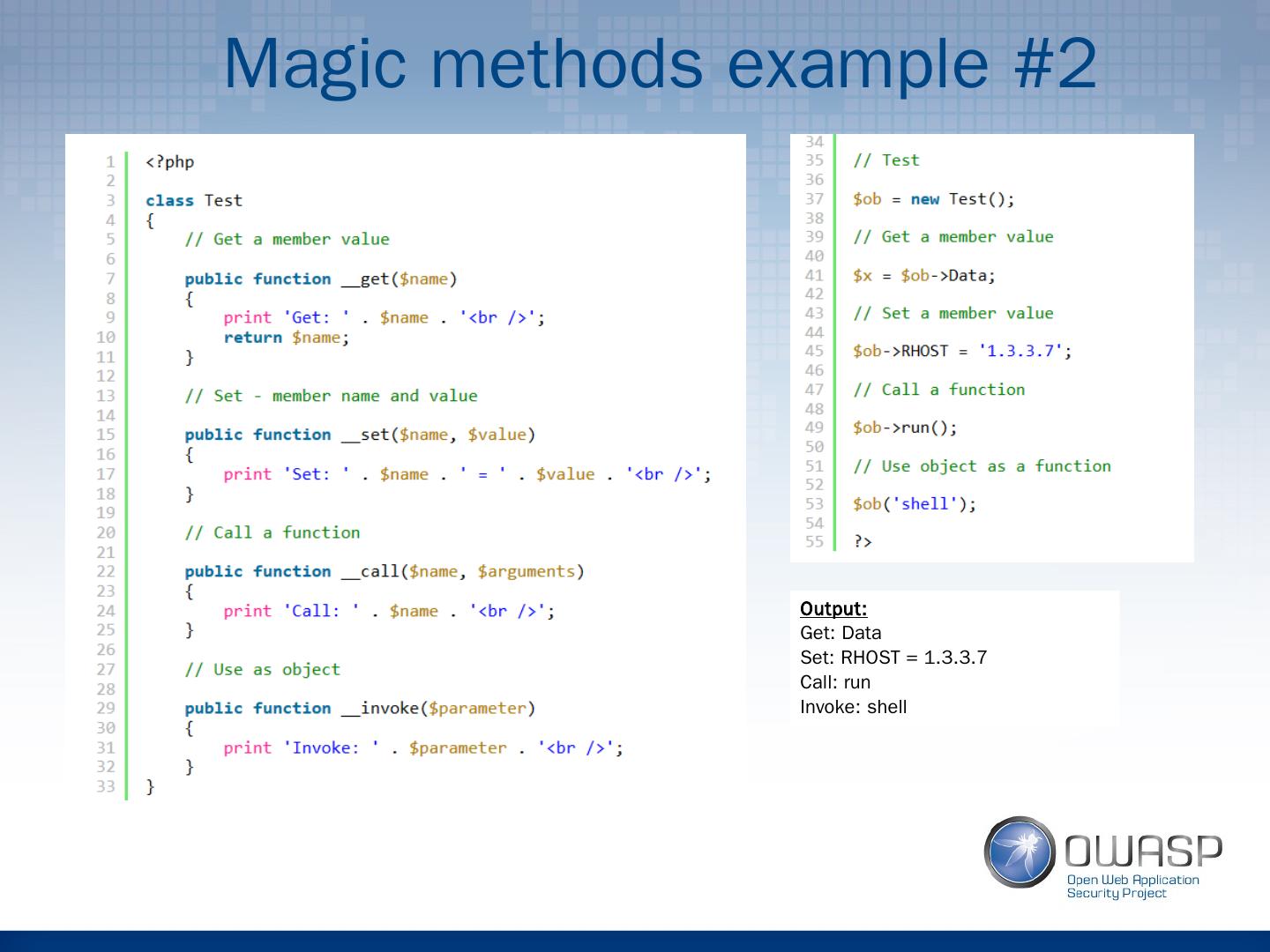 9 .Magic methods example #2 Output: Get: Data Set: RHOST = 1.3.3.7 Call: run Invoke: shell