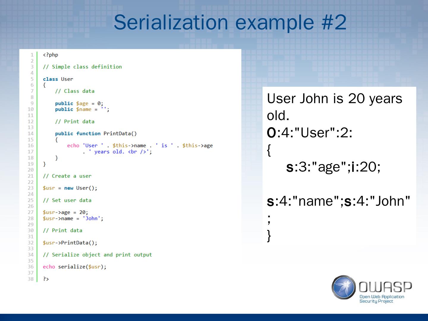 12 .Serialization example #2 User John is 20 years old. O :4:"User":2: { s :3:"age"; i :20; s :4:"name"; s :4:"John"; }