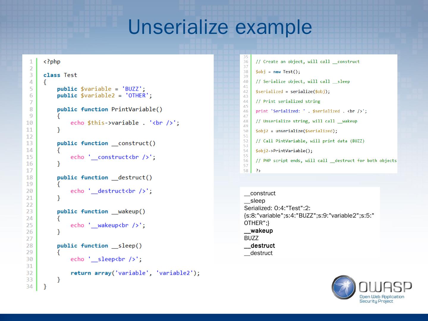 14 .Unserialize example __construct __sleep Serialized: O:4:"Test":2:{s:8:"variable";s:4:"BUZZ";s:9:"variable2";s:5:"OTHER";} __wakeup BUZZ __destruct __destruct