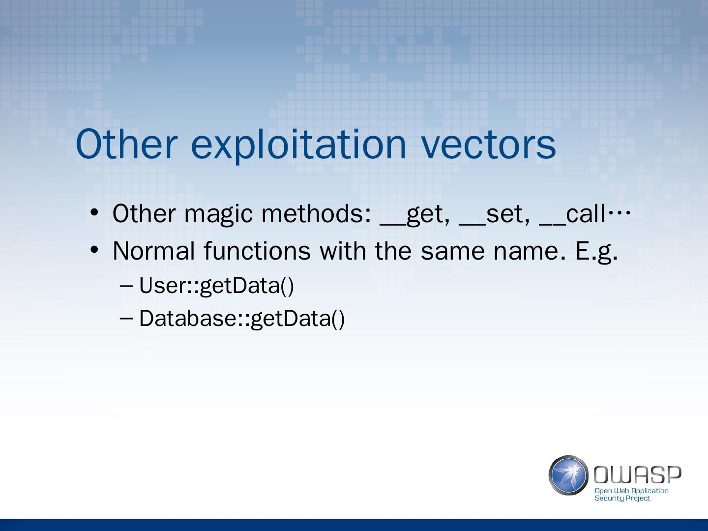 21 .Other exploitation vectors Other magic methods: __get, __set, __call… Normal functions with the same name. E.g. User:: getData () Database:: getData ()