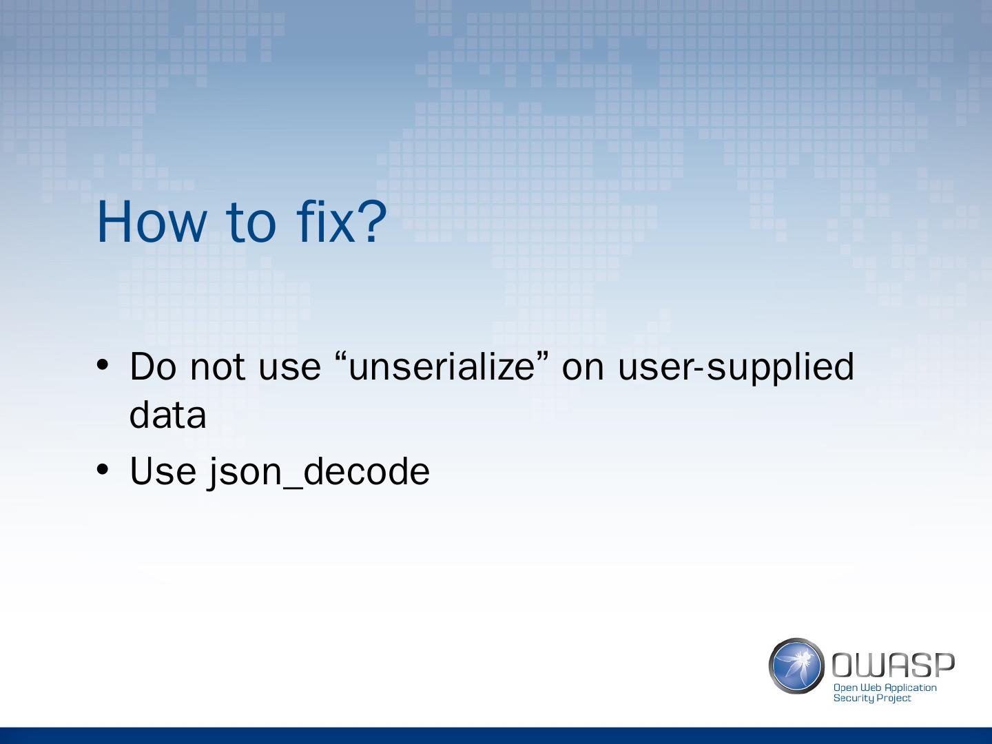 22 .How to fix? Do not use “unserialize” on user-supplied data Use json_decode