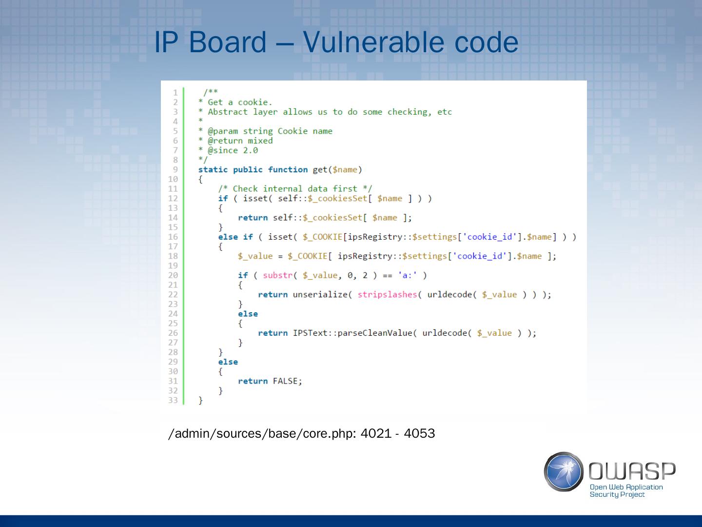 24 .IP Board – Vulnerable code /admin/sources/base/ core.php : 4021 - 4053