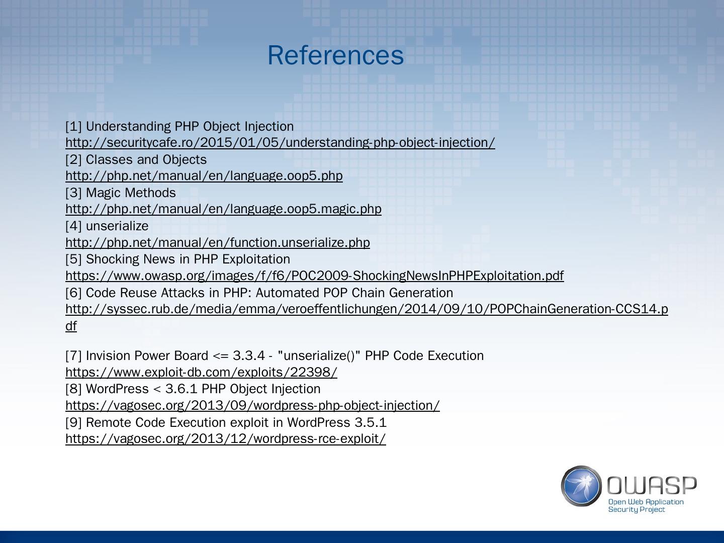 27 .References [1] Understanding PHP Object Injection http://securitycafe.ro/2015/01/05/understanding-php-object-injection/ [2] Classes and Objects http://php.net/manual/en/language.oop5.php [3] Magic Methods http://php.net/manual/en/language.oop5.magic.php [4] unserialize http://php.net/manual/en/function.unserialize.php [5] Shocking News in PHP Exploitation https://www.owasp.org/images/f/f6/POC2009-ShockingNewsInPHPExploitation.pdf [6] Code Reuse Attacks in PHP: Automated POP Chain Generation http://syssec.rub.de/media/emma/veroeffentlichungen/2014/09/10/POPChainGeneration-CCS14.pdf [7] Invision Power Board <= 3.3.4 - "unserialize()" PHP Code Execution https://www.exploit-db.com/exploits/22398/ [8] WordPress < 3.6.1 PHP Object Injection https://vagosec.org/2013/09/wordpress-php-object-injection/ [9] Remote Code Execution exploit in WordPress 3.5.1 https://vagosec.org/2013/12/wordpress-rce-exploit/