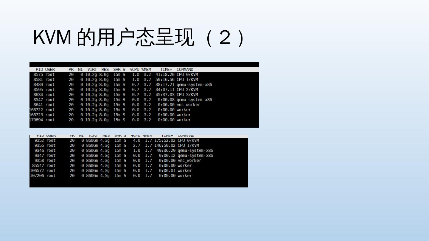 操作系统主要的职能就是管理系统中的各种资源,包括像cpu,内存,磁盘等等。 ... 而KVM则是在linux的基础上实现的,复用了linux的任务调度,内存管理的逻辑,只是 ...