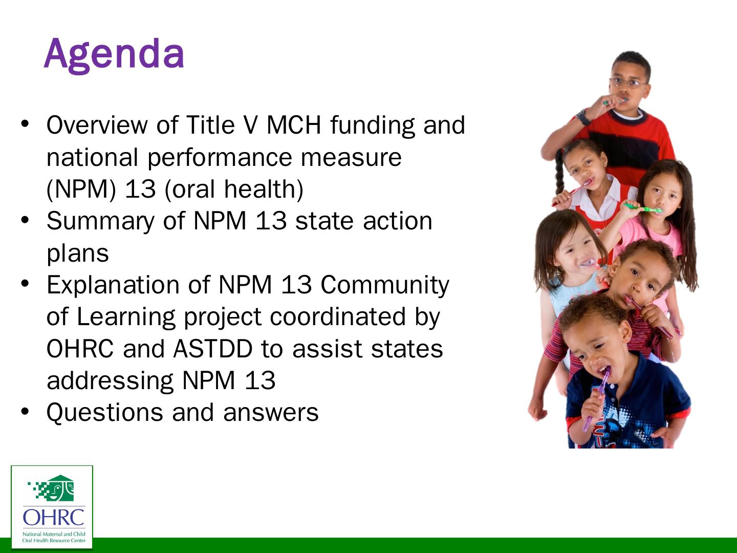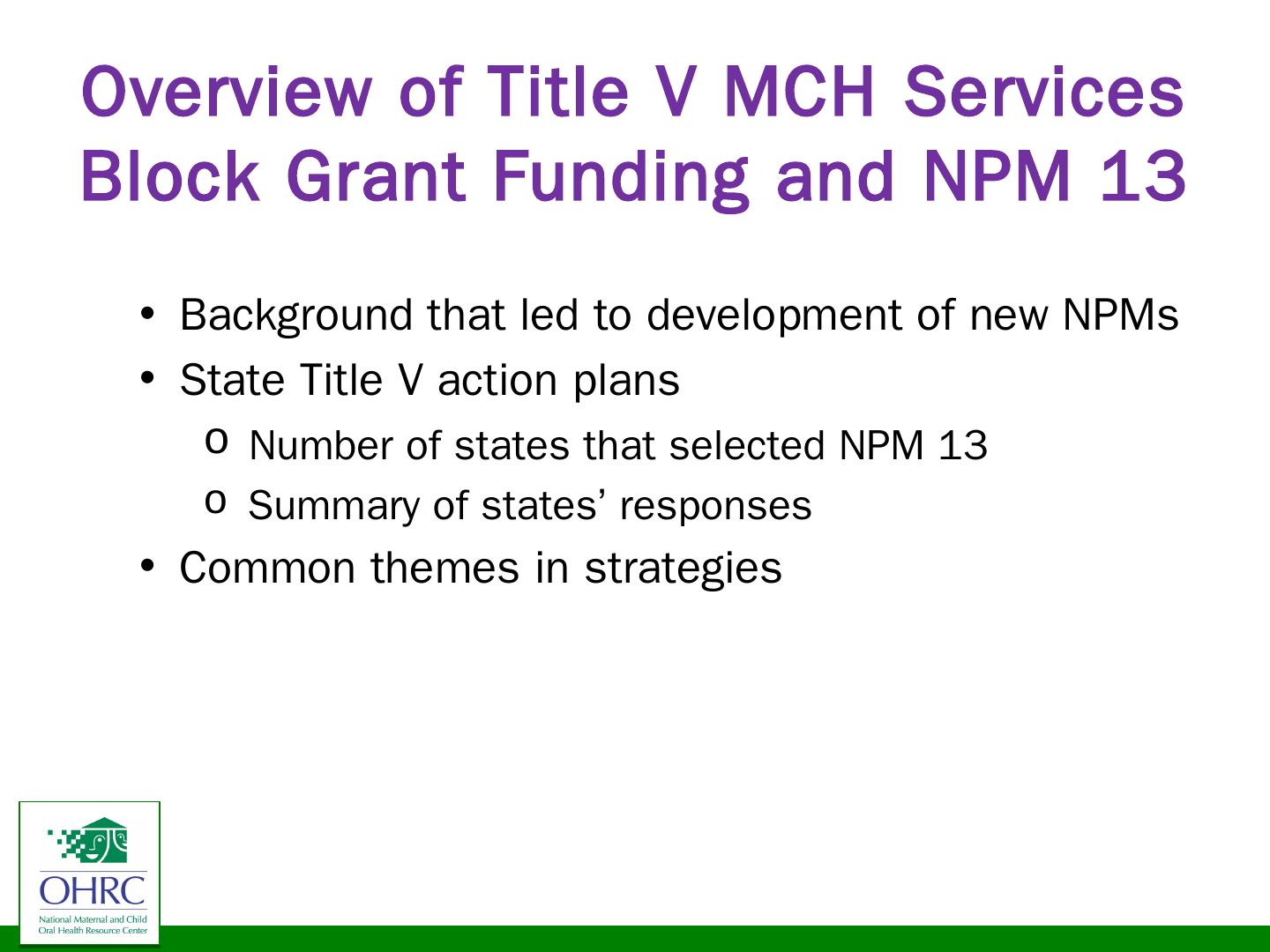Title V MCH Block Grant Funding and NPM 13 Community of Learning Kickoff Webinar January 31, 2017. Funding. This project is supported by the Health ...