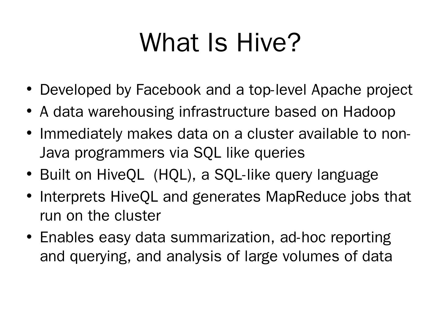 Apache Hive. CMSC 491. Hadoop-Based Distributed Computing. Spring 2016. Adam Shook. What Is Hive? Developed by Facebook and a top-level Apache ...