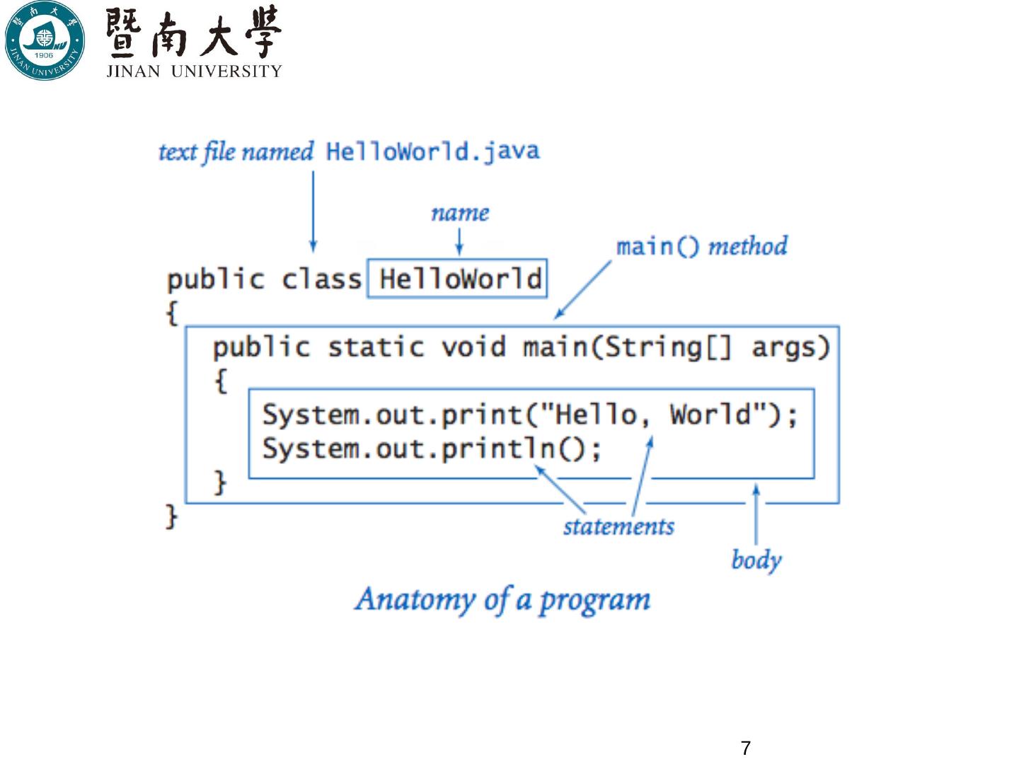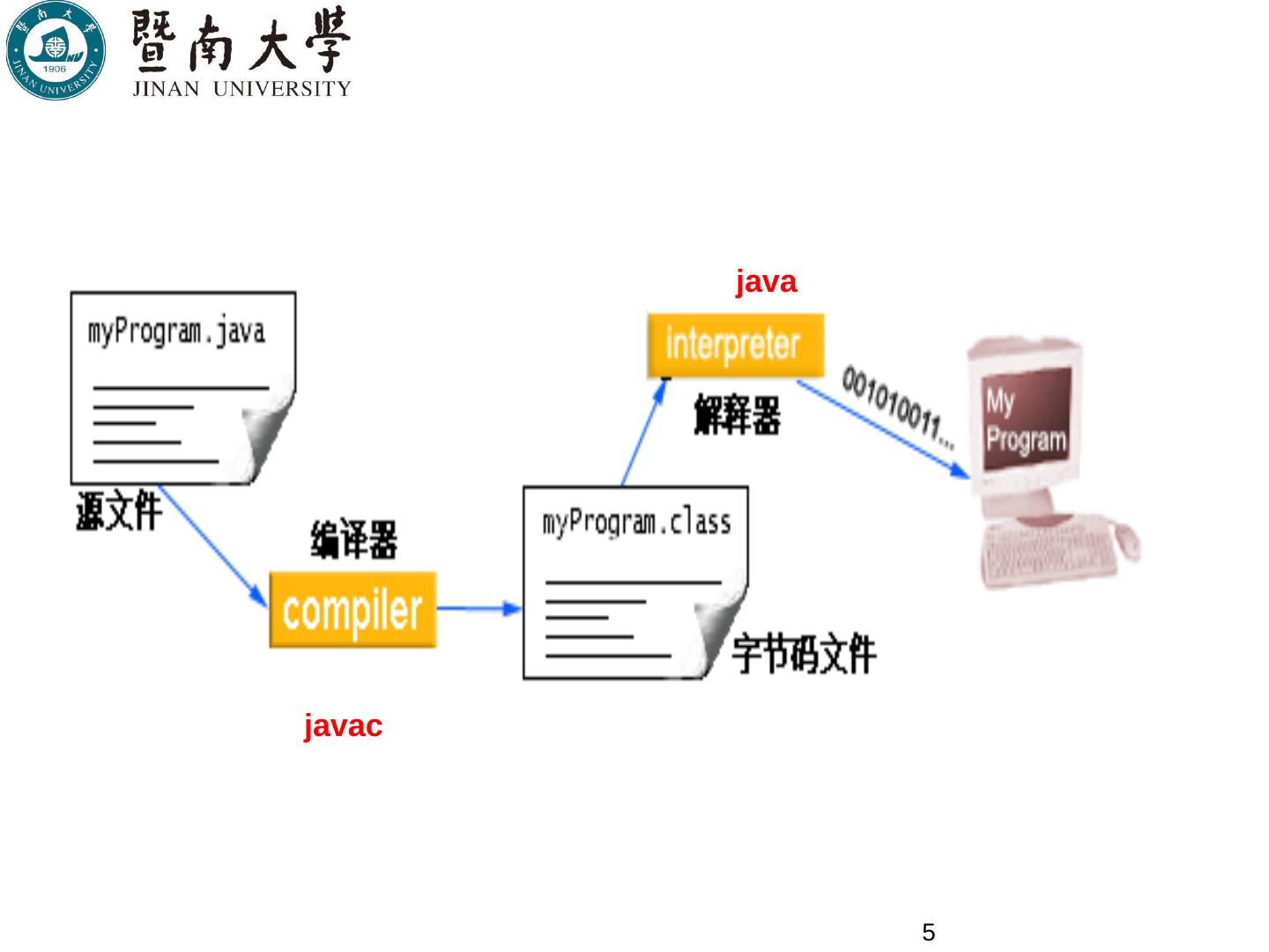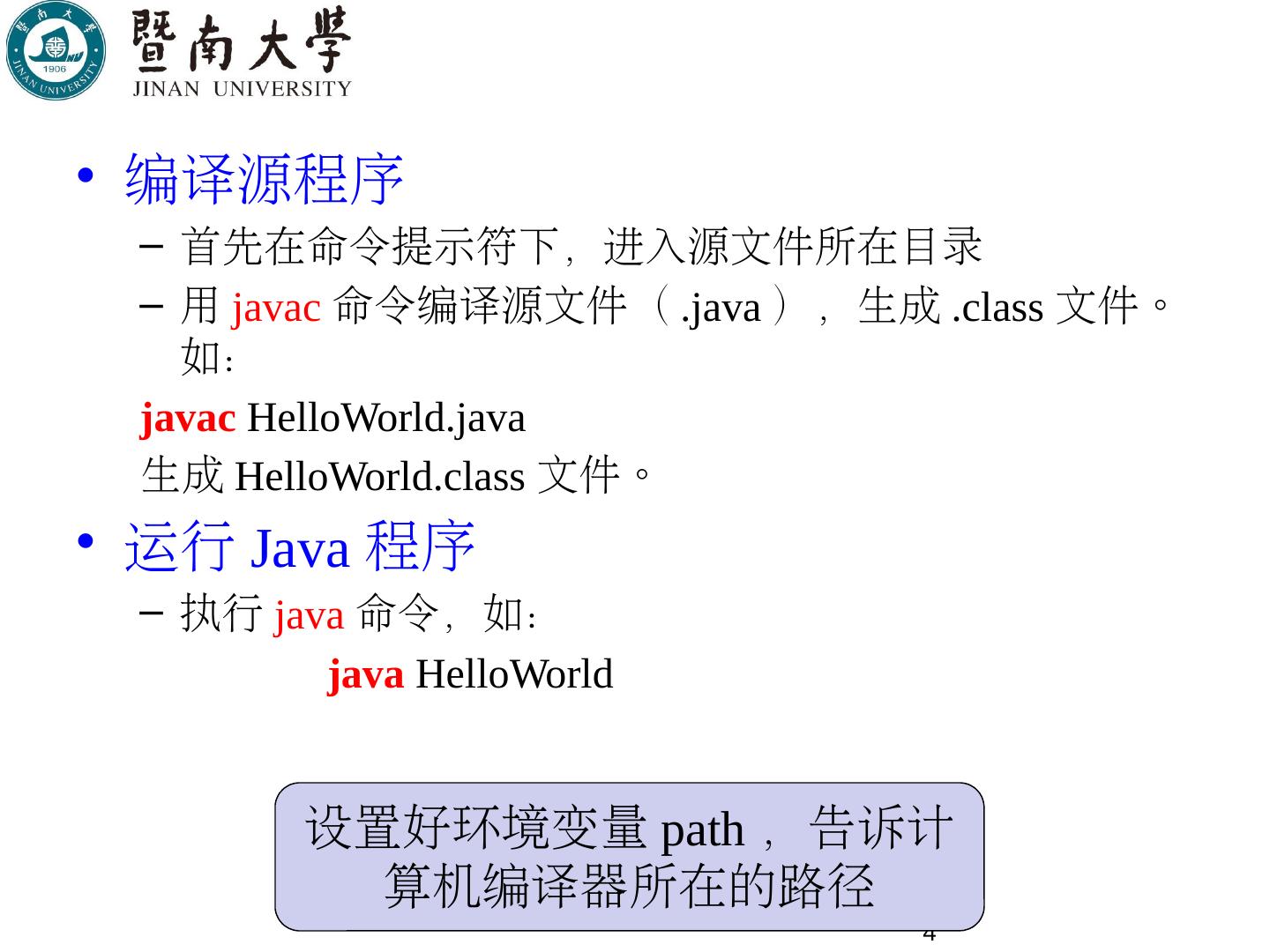 第2章:Java基础. 3. Hello World! 第一个Java程序. 4. 编译源程序. 首先在命令提示符下,进入源文件所在目录; 用javac命令编译源文件(.java),生成.class文件。如:.