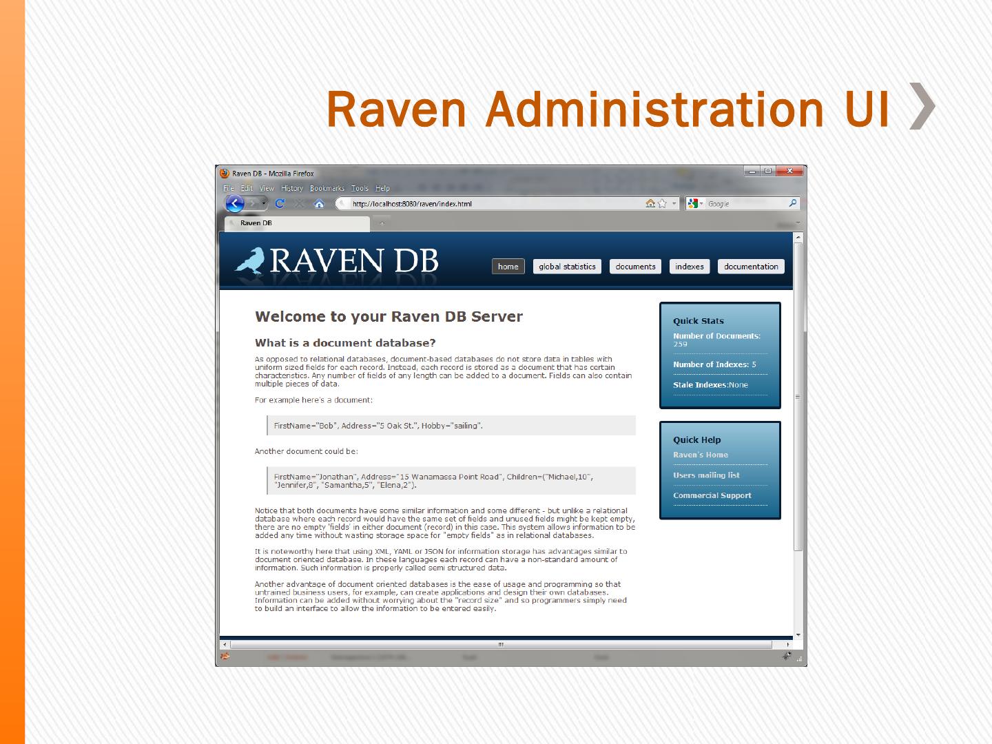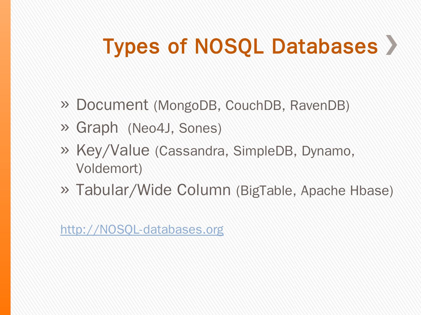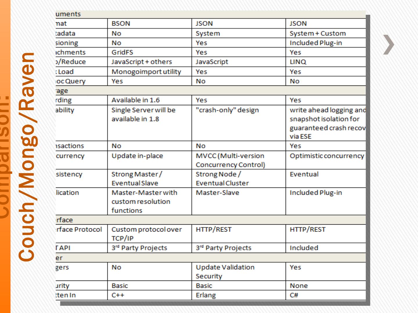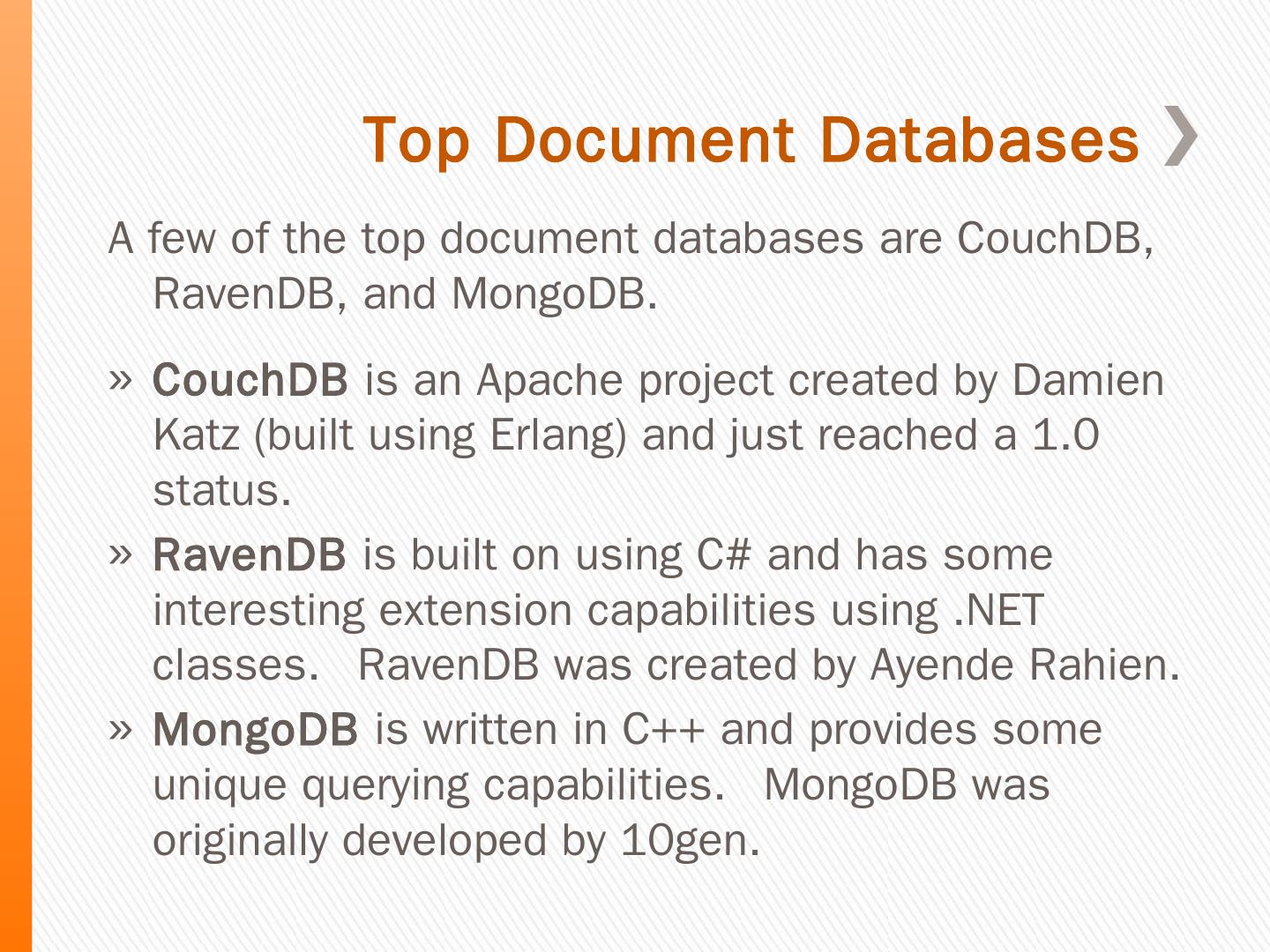 A few of the top document databases are CouchDB, RavenDB, and MongoDB. CouchDB is an Apache project created by Damien Katz (built using Erlang) and ...