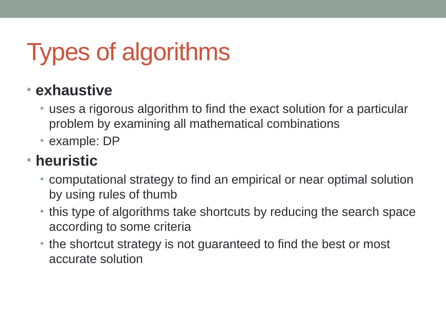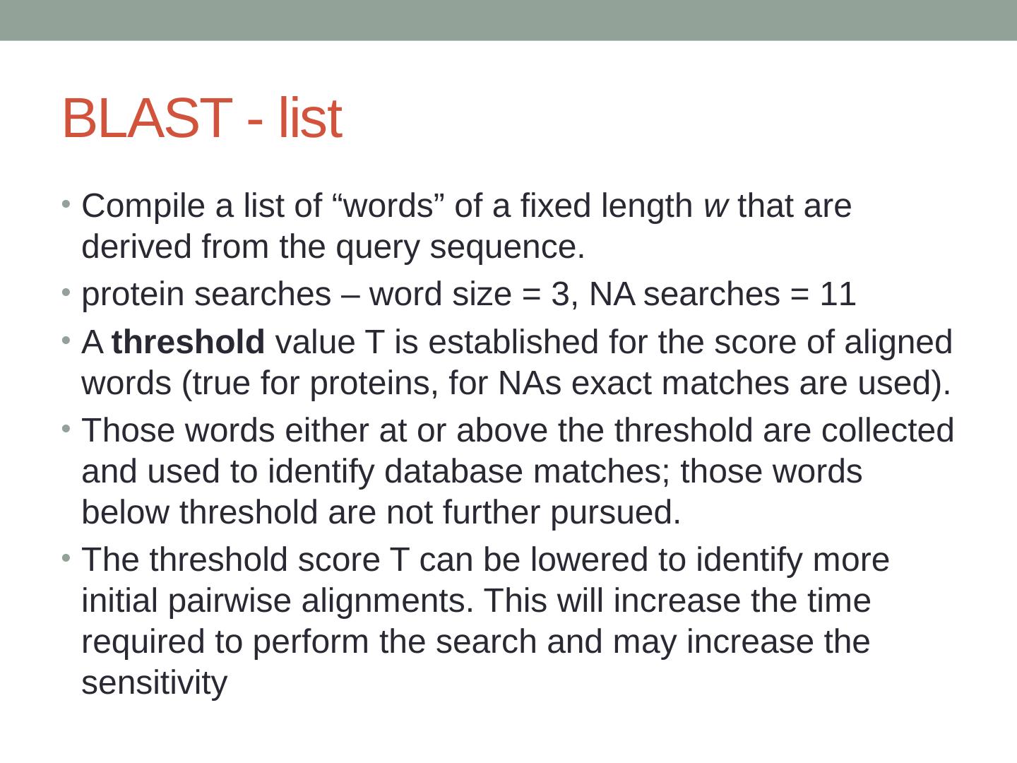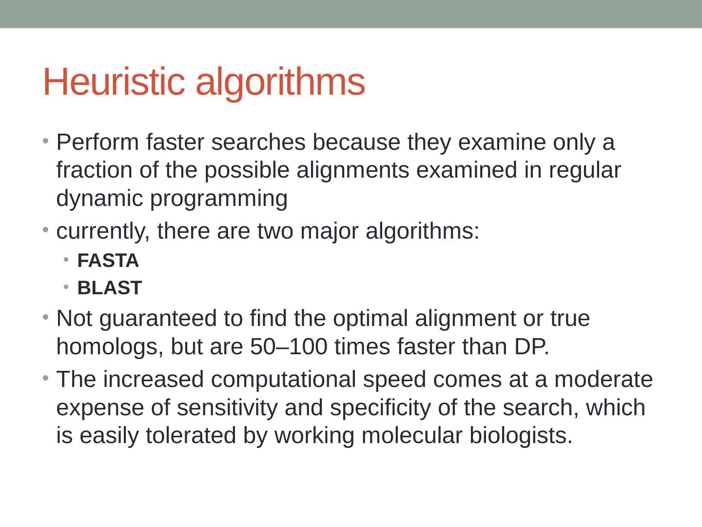 uses a rigorous algorithm to find the exact solution for a particular problem by ... pairs at or above threshold T, the BLAST algorithm scans a database for hits.