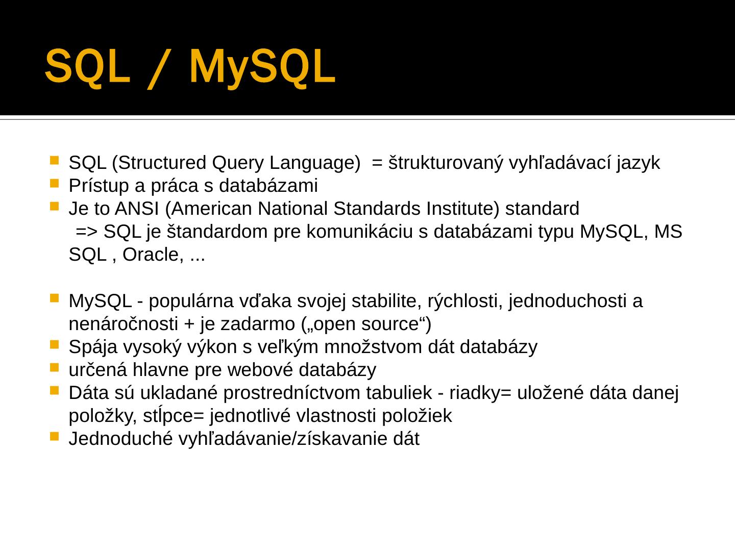 Databázový server MySQL. Michal Hičák, Vladimír Chudáčik. SQL / MySQL. SQL (Structured Query Language) = štrukturovaný vyhľadávací jazyk; Prístup a ...
