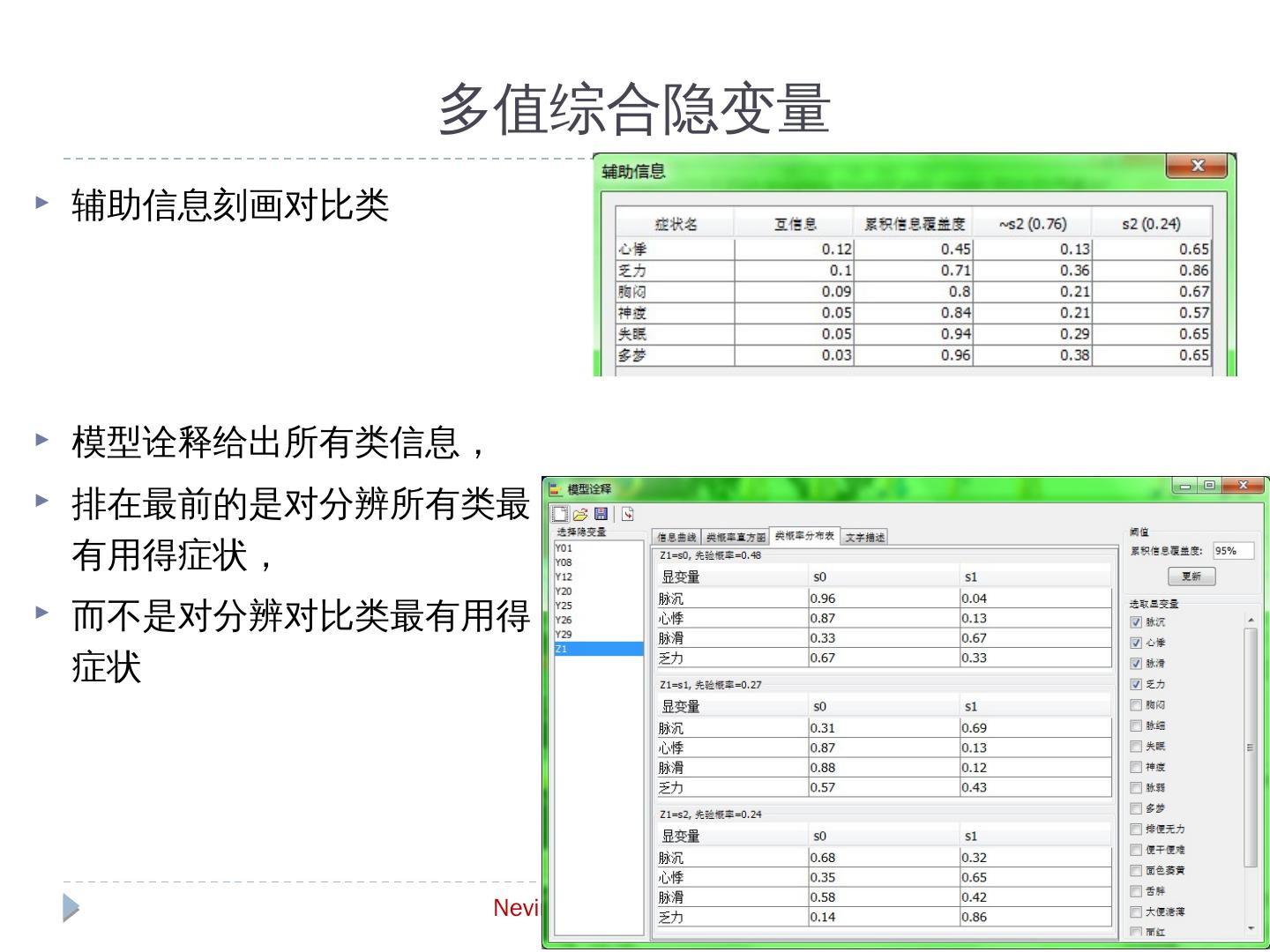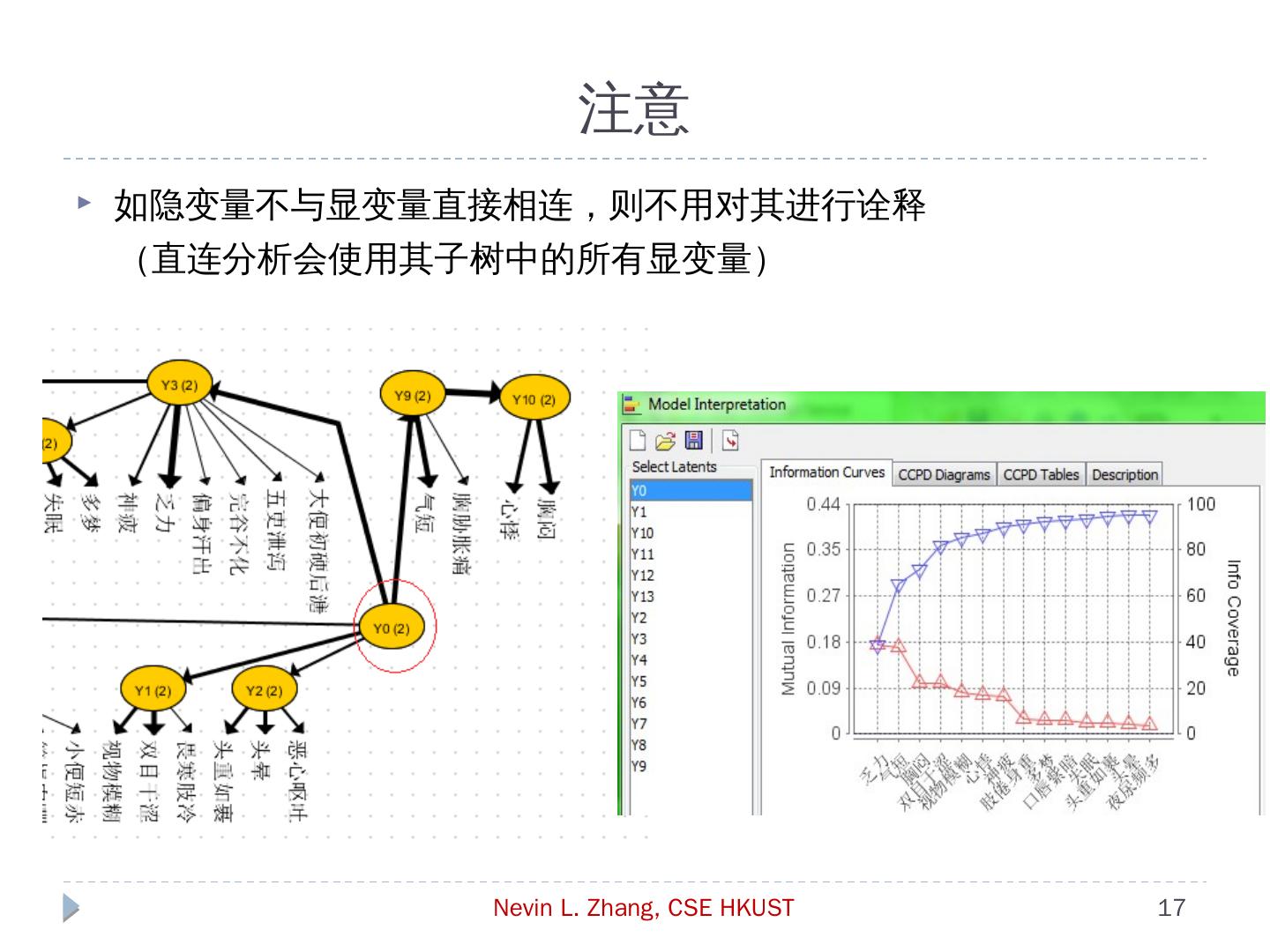 隐树分析; 模型显示; 模型诠释; 综合聚类; 辨证规则. 基本功能 ... 52 症状变量,499条数据. 选择算法. 隐树分析. Nevin L. Zhang, CSE HKUST. 7. BI 快, 但模型质量 ...