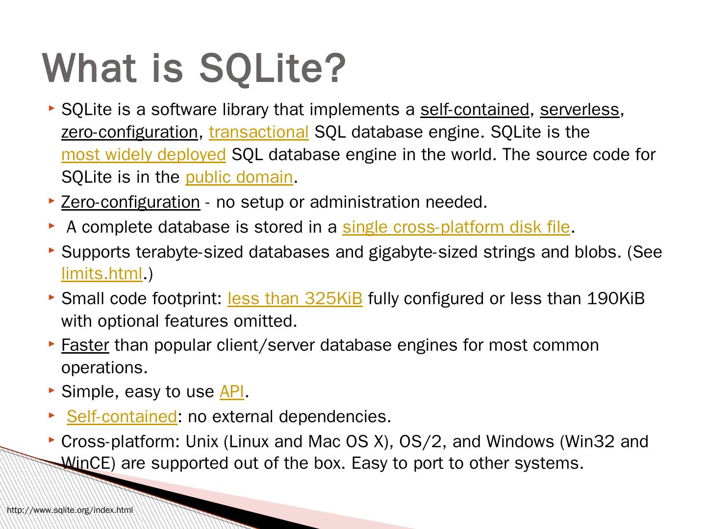 Derby has a small footprint -- about 2.6 megabytes for the base engine and embedded JDBC driver. Derby is based on the Java, JDBC, and SQL standards.