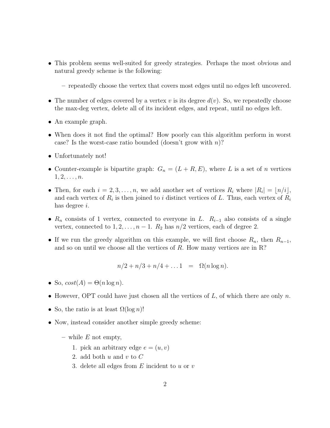 2 .• This problem seems well-suited for greedy strategies. Perhaps the most obvious and natural greedy scheme is the following: – repeatedly choose the vertex that covers most edges until no edges left uncovered. • The number of edges covered by a vertex v is its degree d(v). So, we repeatedly choose the max-deg vertex, delete all of its incident edges, and repeat, until no edges left. • An example graph. • When does it not find the optimal? How poorly can this algorithm perform in worst case? Is the worst-case ratio bounded (doesn’t grow with n)? • Unfortunately not! • Counter-example is bipartite graph: Gn = (L + R, E), where L is a set of n vertices 1, 2, . . . , n. • Then, for each i = 2, 3, . . . , n, we add another set of vertices Ri where |Ri | = n/i , and each vertex of Ri is then joined to i distinct vertices of L. Thus, each vertex of Ri has degree i. • Rn consists of 1 vertex, connected to everyone in L. Ri−1 also consists of a single vertex, connected to 1, 2, . . . , n − 1. R2 has n/2 vertices, each of degree 2. • If we run the greedy algorithm on this example, we will first choose Rn , then Rn−1 , and so on until we choose all the vertices of R. How many vertices are in R? n/2 + n/3 + n/4 + . . . 1 = Ω(n log n). • So, cost(A) = Θ(n log n). • However, OPT could have just chosen all the vertices of L, of which there are only n. • So, the ratio is at least Ω(log n)! • Now, instead consider another simple greedy scheme: – while E not empty, 1. pick an arbitrary edge e = (u, v) 2. add both u and v to C 3. delete all edges from E incident to u or v 2