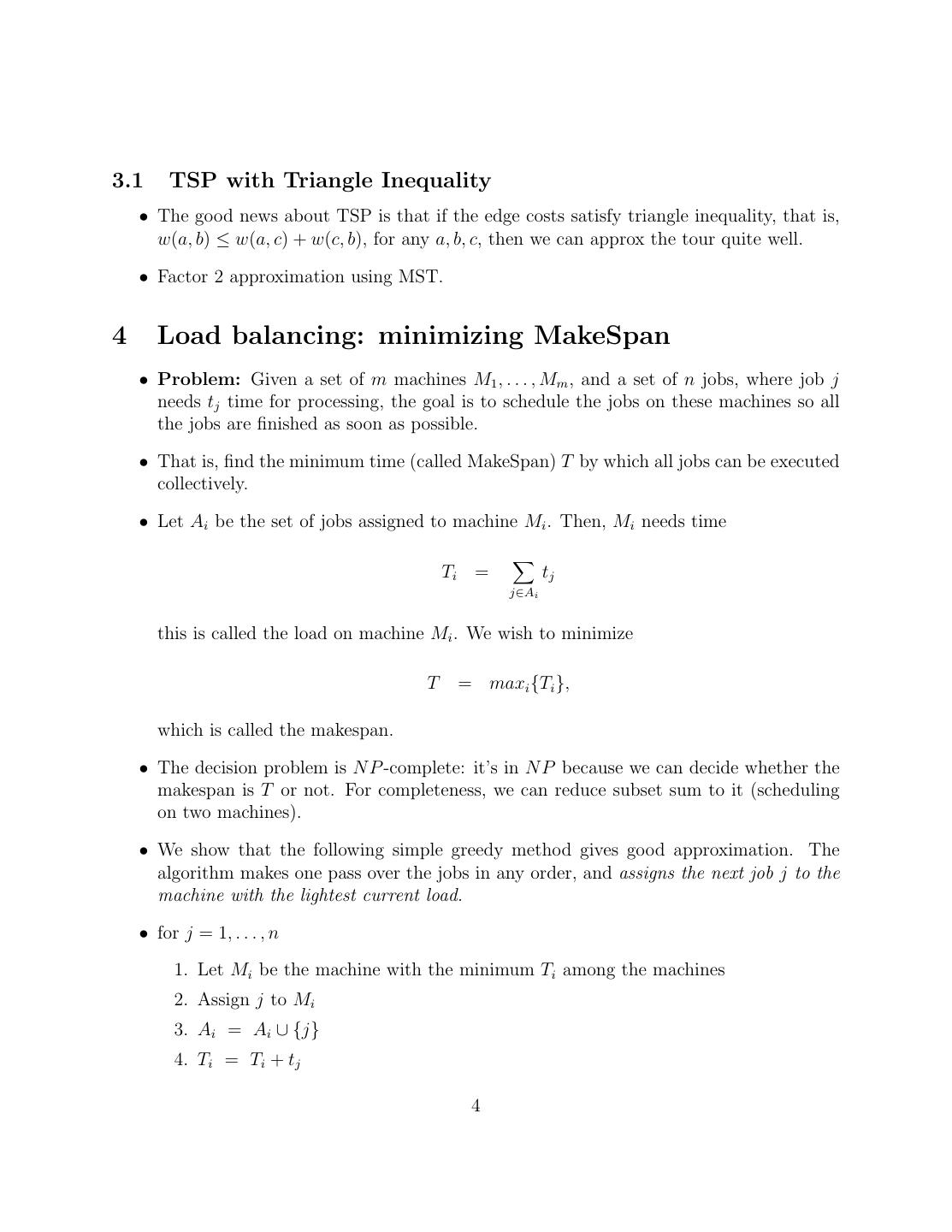 4 .3.1 TSP with Triangle Inequality • The good news about TSP is that if the edge costs satisfy triangle inequality, that is, w(a, b) ≤ w(a, c) + w(c, b), for any a, b, c, then we can approx the tour quite well. • Factor 2 approximation using MST. 4 Load balancing: minimizing MakeSpan • Problem: Given a set of m machines M1 , . . . , Mm , and a set of n jobs, where job j needs tj time for processing, the goal is to schedule the jobs on these machines so all the jobs are finished as soon as possible. • That is, find the minimum time (called MakeSpan) T by which all jobs can be executed collectively. • Let Ai be the set of jobs assigned to machine Mi . Then, Mi needs time Ti = tj j∈Ai this is called the load on machine Mi . We wish to minimize T = maxi {Ti }, which is called the makespan. • The decision problem is N P -complete: it’s in N P because we can decide whether the makespan is T or not. For completeness, we can reduce subset sum to it (scheduling on two machines). • We show that the following simple greedy method gives good approximation. The algorithm makes one pass over the jobs in any order, and assigns the next job j to the machine with the lightest current load. • for j = 1, . . . , n 1. Let Mi be the machine with the minimum Ti among the machines 2. Assign j to Mi 3. Ai = Ai ∪ {j} 4. Ti = Ti + tj 4