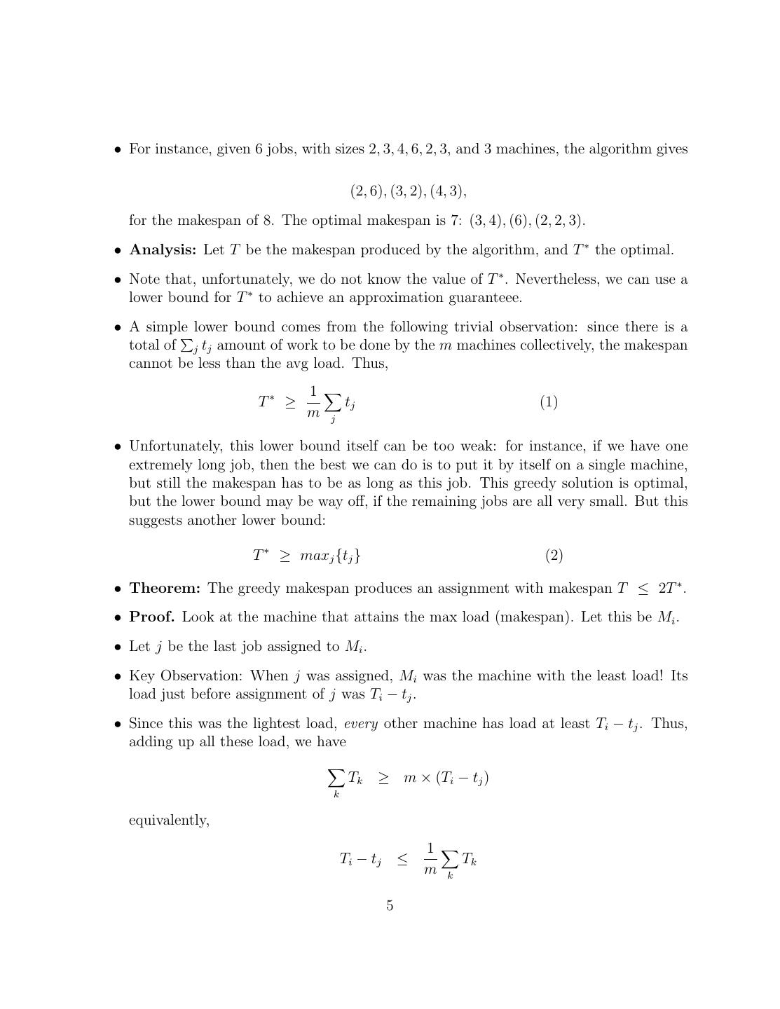 5 .• For instance, given 6 jobs, with sizes 2, 3, 4, 6, 2, 3, and 3 machines, the algorithm gives (2, 6), (3, 2), (4, 3), for the makespan of 8. The optimal makespan is 7: (3, 4), (6), (2, 2, 3). • Analysis: Let T be the makespan produced by the algorithm, and T ∗ the optimal. • Note that, unfortunately, we do not know the value of T ∗ . Nevertheless, we can use a lower bound for T ∗ to achieve an approximation guaranteee. • A simple lower bound comes from the following trivial observation: since there is a total of j tj amount of work to be done by the m machines collectively, the makespan cannot be less than the avg load. Thus, 1 T∗ ≥ tj (1) m j • Unfortunately, this lower bound itself can be too weak: for instance, if we have one extremely long job, then the best we can do is to put it by itself on a single machine, but still the makespan has to be as long as this job. This greedy solution is optimal, but the lower bound may be way off, if the remaining jobs are all very small. But this suggests another lower bound: T ∗ ≥ maxj {tj } (2) • Theorem: The greedy makespan produces an assignment with makespan T ≤ 2T ∗ . • Proof. Look at the machine that attains the max load (makespan). Let this be Mi . • Let j be the last job assigned to Mi . • Key Observation: When j was assigned, Mi was the machine with the least load! Its load just before assignment of j was Ti − tj . • Since this was the lightest load, every other machine has load at least Ti − tj . Thus, adding up all these load, we have Tk ≥ m × (Ti − tj ) k equivalently, 1 Ti − tj ≤ Tk m k 5