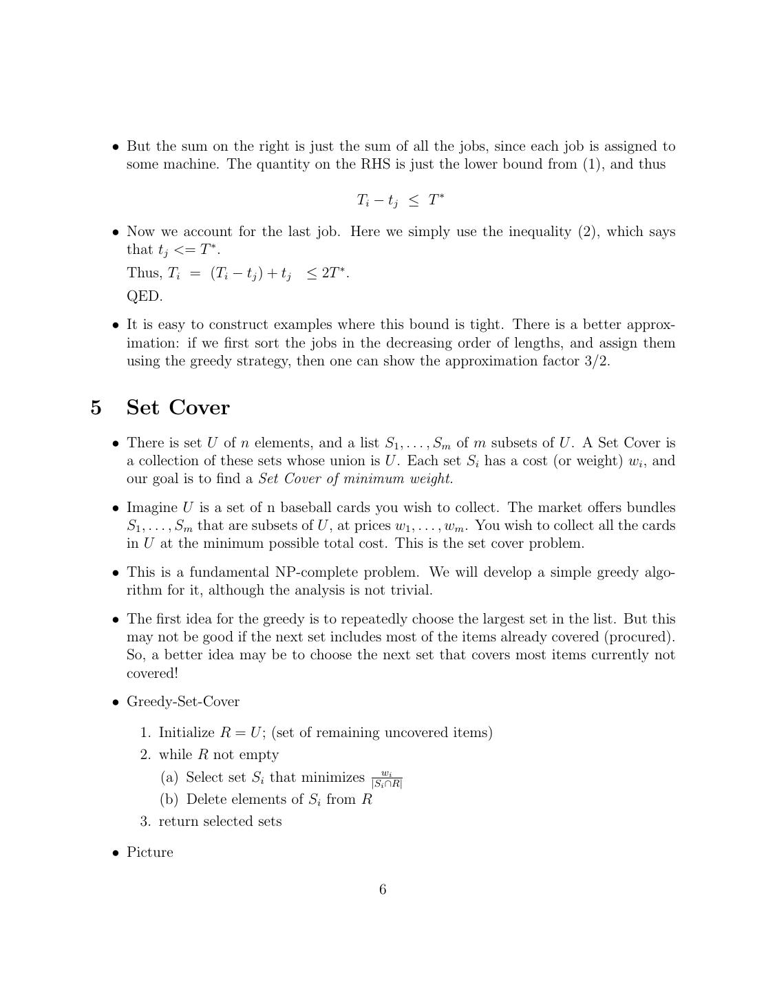 6 . • But the sum on the right is just the sum of all the jobs, since each job is assigned to some machine. The quantity on the RHS is just the lower bound from (1), and thus Ti − tj ≤ T ∗ • Now we account for the last job. Here we simply use the inequality (2), which says that tj <= T ∗ . Thus, Ti = (Ti − tj ) + tj ≤ 2T ∗ . QED. • It is easy to construct examples where this bound is tight. There is a better approx- imation: if we first sort the jobs in the decreasing order of lengths, and assign them using the greedy strategy, then one can show the approximation factor 3/2. 5 Set Cover • There is set U of n elements, and a list S1 , . . . , Sm of m subsets of U . A Set Cover is a collection of these sets whose union is U . Each set Si has a cost (or weight) wi , and our goal is to find a Set Cover of minimum weight. • Imagine U is a set of n baseball cards you wish to collect. The market offers bundles S1 , . . . , Sm that are subsets of U , at prices w1 , . . . , wm . You wish to collect all the cards in U at the minimum possible total cost. This is the set cover problem. • This is a fundamental NP-complete problem. We will develop a simple greedy algo- rithm for it, although the analysis is not trivial. • The first idea for the greedy is to repeatedly choose the largest set in the list. But this may not be good if the next set includes most of the items already covered (procured). So, a better idea may be to choose the next set that covers most items currently not covered! • Greedy-Set-Cover 1. Initialize R = U ; (set of remaining uncovered items) 2. while R not empty (a) Select set Si that minimizes |Siw∩R| i (b) Delete elements of Si from R 3. return selected sets • Picture 6