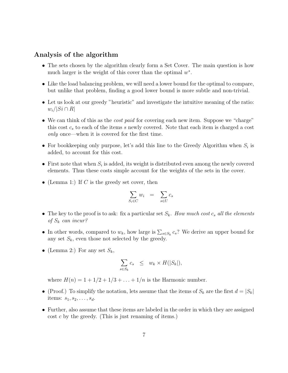 7 .Analysis of the algorithm • The sets chosen by the algorithm clearly form a Set Cover. The main question is how much larger is the weight of this cover than the optimal w∗ . • Like the load balancing problem, we will need a lower bound for the optimal to compare, but unlike that problem, finding a good lower bound is more subtle and non-trivial. • Let us look at our greedy ”heuristic” and investigate the intuitive meaning of the ratio: wi /|Si ∩ R| • We can think of this as the cost paid for covering each new item. Suppose we “charge” this cost cs to each of the items s newly covered. Note that each item is charged a cost only once—when it is covered for the first time. • For bookkeeping only purpose, let’s add this line to the Greedy Algorithm when Si is added, to account for this cost. • First note that when Si is added, its weight is distributed even among the newly covered elements. Thus these costs simple account for the weights of the sets in the cover. • (Lemma 1:) If C is the greedy set cover, then wi = cs Si ∈C s∈U • The key to the proof is to ask: fix a particular set Sk . How much cost cs all the elements of Sk can incur? • In other words, compared to wk , how large is s∈Sk cs ? We derive an upper bound for any set Sk , even those not selected by the greedy. • (Lemma 2:) For any set Sk , cs ≤ wk × H(|Sk |), s∈Sk where H(n) = 1 + 1/2 + 1/3 + . . . + 1/n is the Harmonic number. • (Proof.) To simplify the notation, lets assume that the items of Sk are the first d = |Sk | items: s1 , s2 , . . . , sd . • Further, also assume that these items are labeled in the order in which they are assigned cost c by the greedy. (This is just renaming of items.) 7