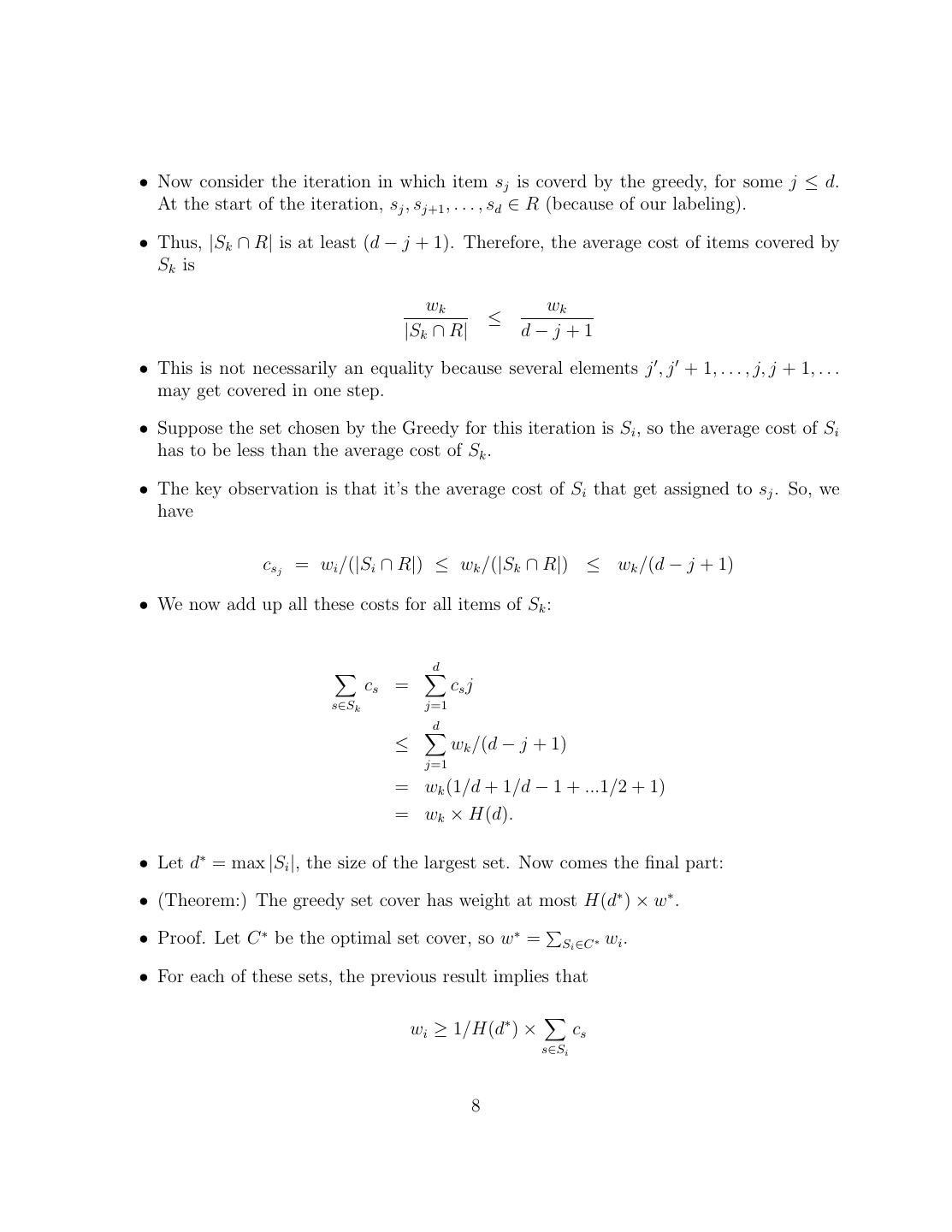 8 .• Now consider the iteration in which item sj is coverd by the greedy, for some j ≤ d. At the start of the iteration, sj , sj+1 , . . . , sd ∈ R (because of our labeling). • Thus, |Sk ∩ R| is at least (d − j + 1). Therefore, the average cost of items covered by Sk is wk wk ≤ |Sk ∩ R| d−j+1 • This is not necessarily an equality because several elements j , j + 1, . . . , j, j + 1, . . . may get covered in one step. • Suppose the set chosen by the Greedy for this iteration is Si , so the average cost of Si has to be less than the average cost of Sk . • The key observation is that it’s the average cost of Si that get assigned to sj . So, we have csj = wi /(|Si ∩ R|) ≤ wk /(|Sk ∩ R|) ≤ wk /(d − j + 1) • We now add up all these costs for all items of Sk : d cs = cs j s∈Sk j=1 d ≤ wk /(d − j + 1) j=1 = wk (1/d + 1/d − 1 + ...1/2 + 1) = wk × H(d). • Let d∗ = max |Si |, the size of the largest set. Now comes the final part: • (Theorem:) The greedy set cover has weight at most H(d∗ ) × w∗ . • Proof. Let C ∗ be the optimal set cover, so w∗ = Si ∈C ∗ wi . • For each of these sets, the previous result implies that wi ≥ 1/H(d∗ ) × cs s∈Si 8