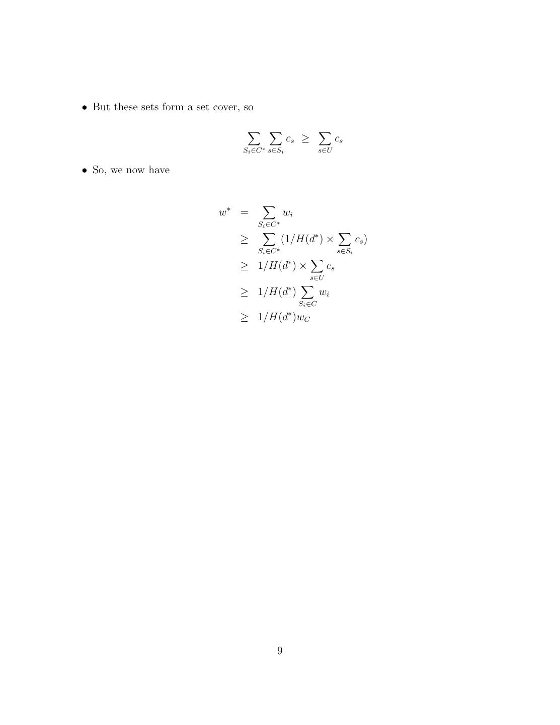 9 .• But these sets form a set cover, so cs ≥ cs Si ∈C ∗ s∈Si s∈U • So, we now have w∗ = wi Si ∈C ∗ ≥ (1/H(d∗ ) × cs ) Si ∈C ∗ s∈Si ≥ 1/H(d∗ ) × cs s∈U ≥ 1/H(d∗ ) wi Si ∈C ≥ 1/H(d∗ )wC 9