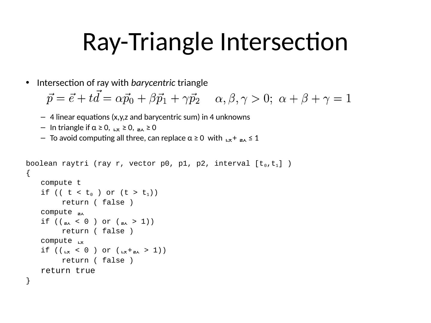 11 .Ray-Triangle Intersection Intersection of ray with barycentric triangle 4 linear equations ( x,y,z and barycentric sum) in 4 unknowns In triangle if α ≥ 0, ≥ 0, ≥ 0 To avoid computing all three, can replace α ≥ 0 with + ≤ 1 boolean raytri (ray r, vector p0, p1 , p2, interval [t 0 ,t 1 ] ) { compute t if (( t < t 0 ) or (t > t 1 )) return ( false ) compute if (( < 0 ) or ( > 1)) return ( false ) compute if (( < 0 ) or ( + > 1)) return ( false ) return true }