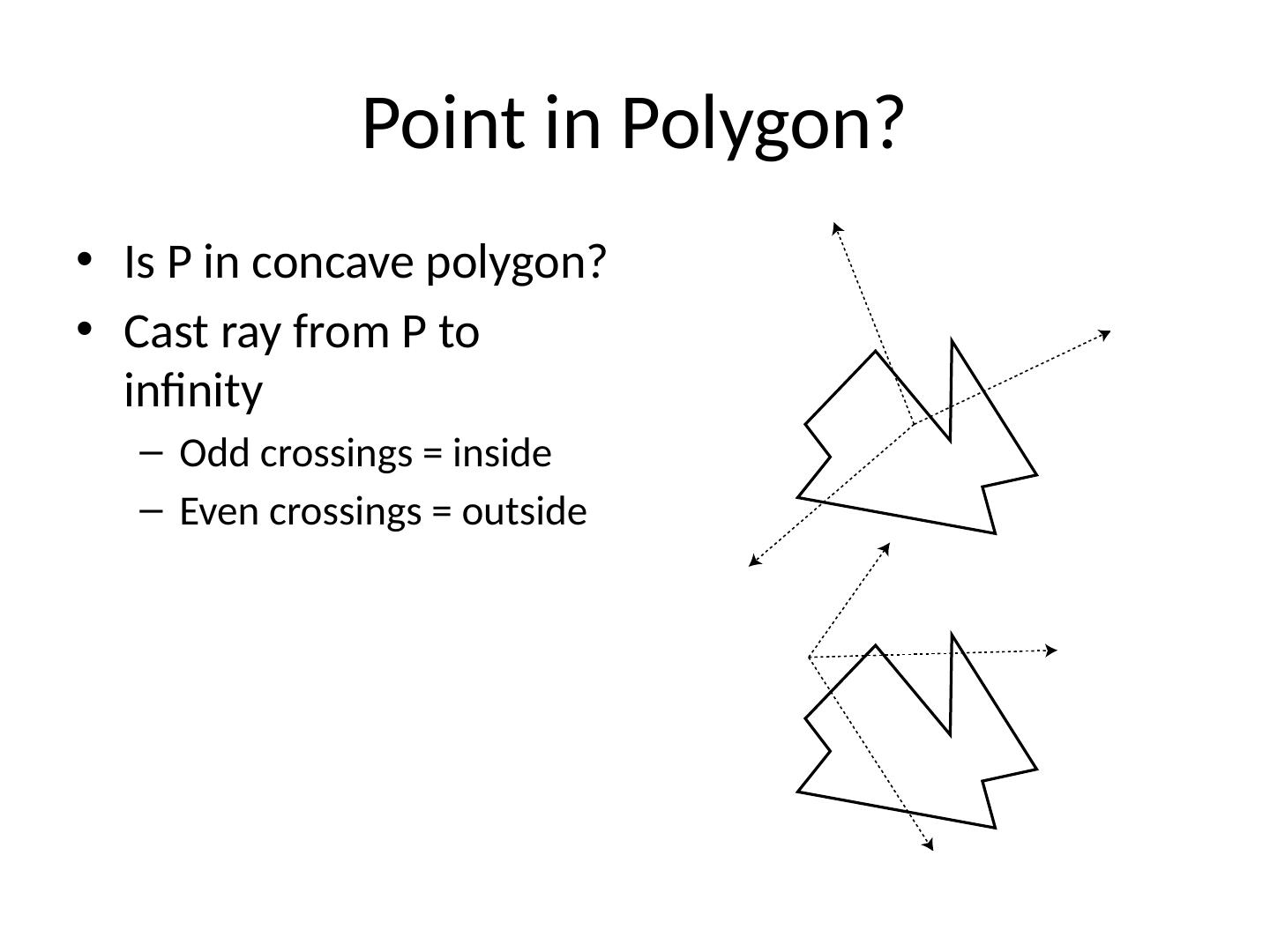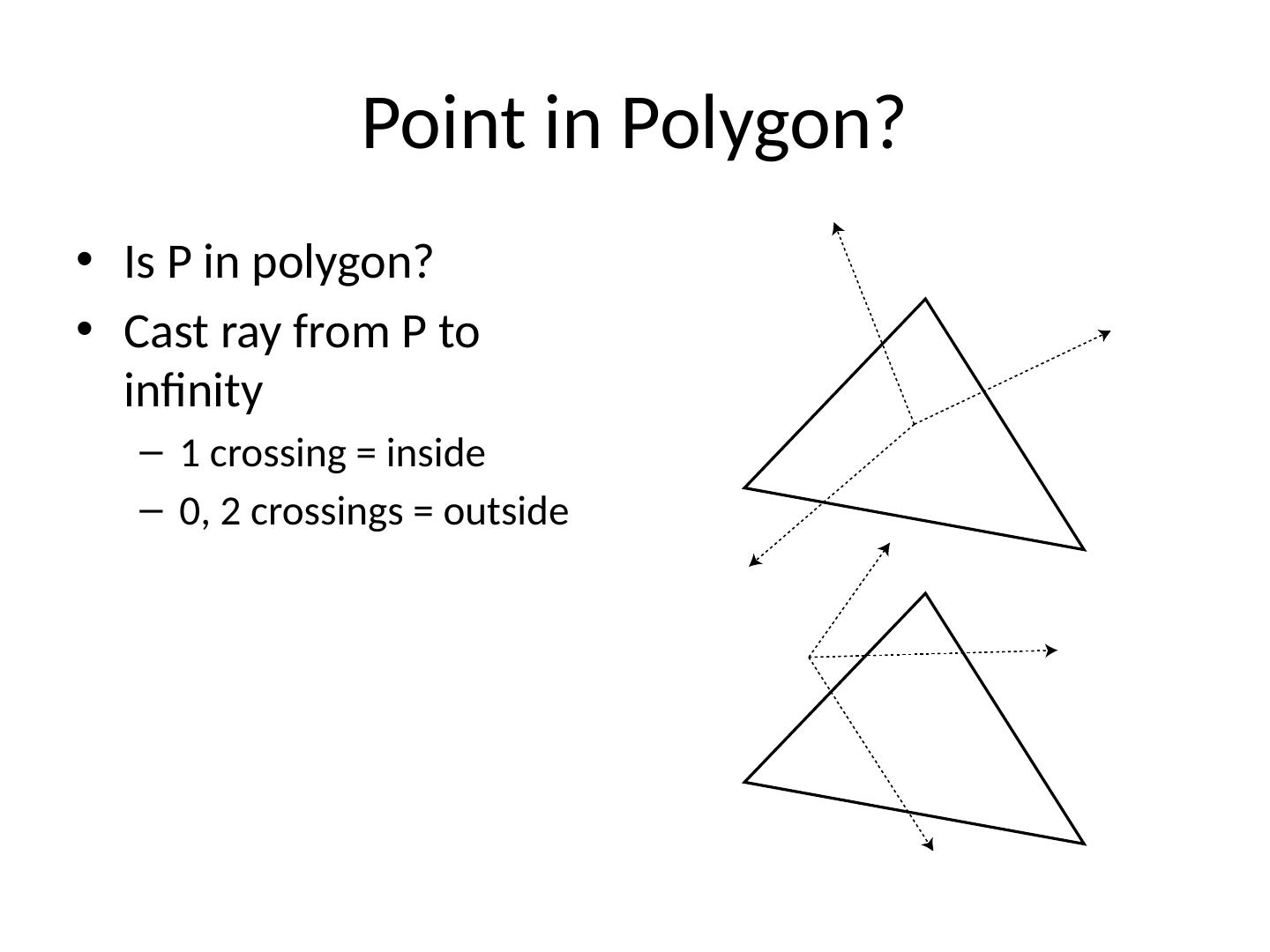 13 .Point in Polygon? Is P in polygon? Cast ray from P to infinity 1 crossing = inside 0 , 2 crossings = outside