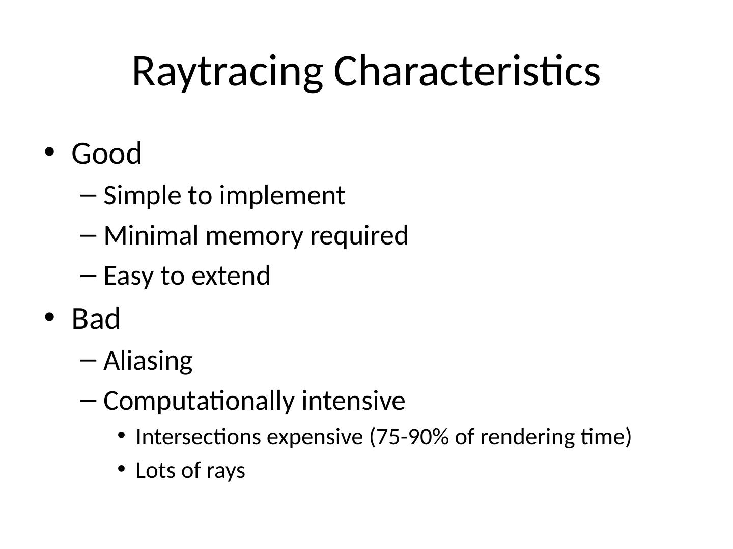 16 .Raytracing Characteristics Good Simple to implement Minimal memory required Easy to extend Bad Aliasing Computationally intensive Intersections expensive (75-90% of rendering time) Lots of rays