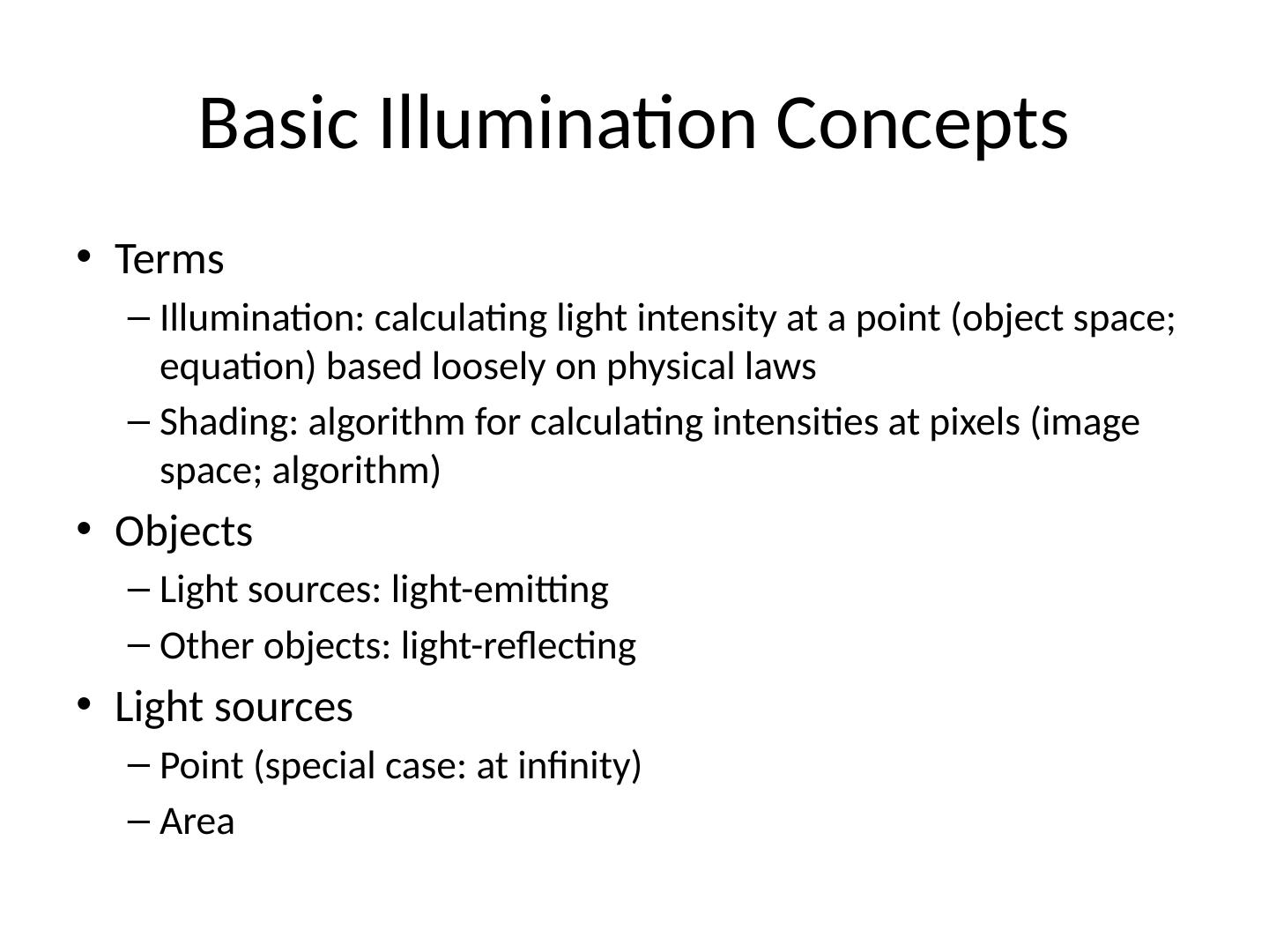 17 .Basic Illumination Concepts Terms Illumination: calculating light intensity at a point (object space; equation) based loosely on physical laws Shading: algorithm for calculating intensities at pixels (image space; algorithm) Objects Light sources: light-emitting Other objects: light-reflecting Light sources Point (special case: at infinity) Area