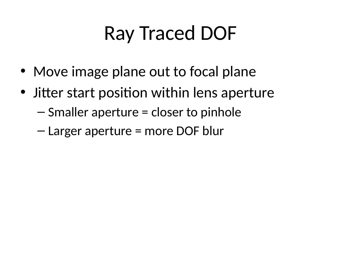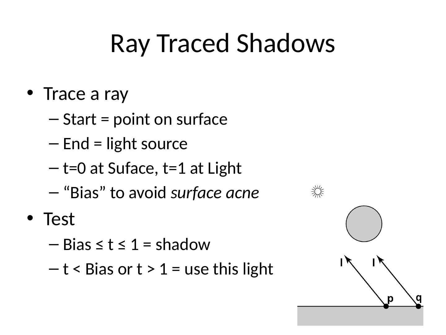 23 .Ray Traced Shadows Trace a ray Start = point on surface End = light source t=0 at Suface , t=1 at Light “Bias” to avoid surface acne Test Bias ≤ t ≤ 1 = shadow t < Bias or t > 1 = use this light