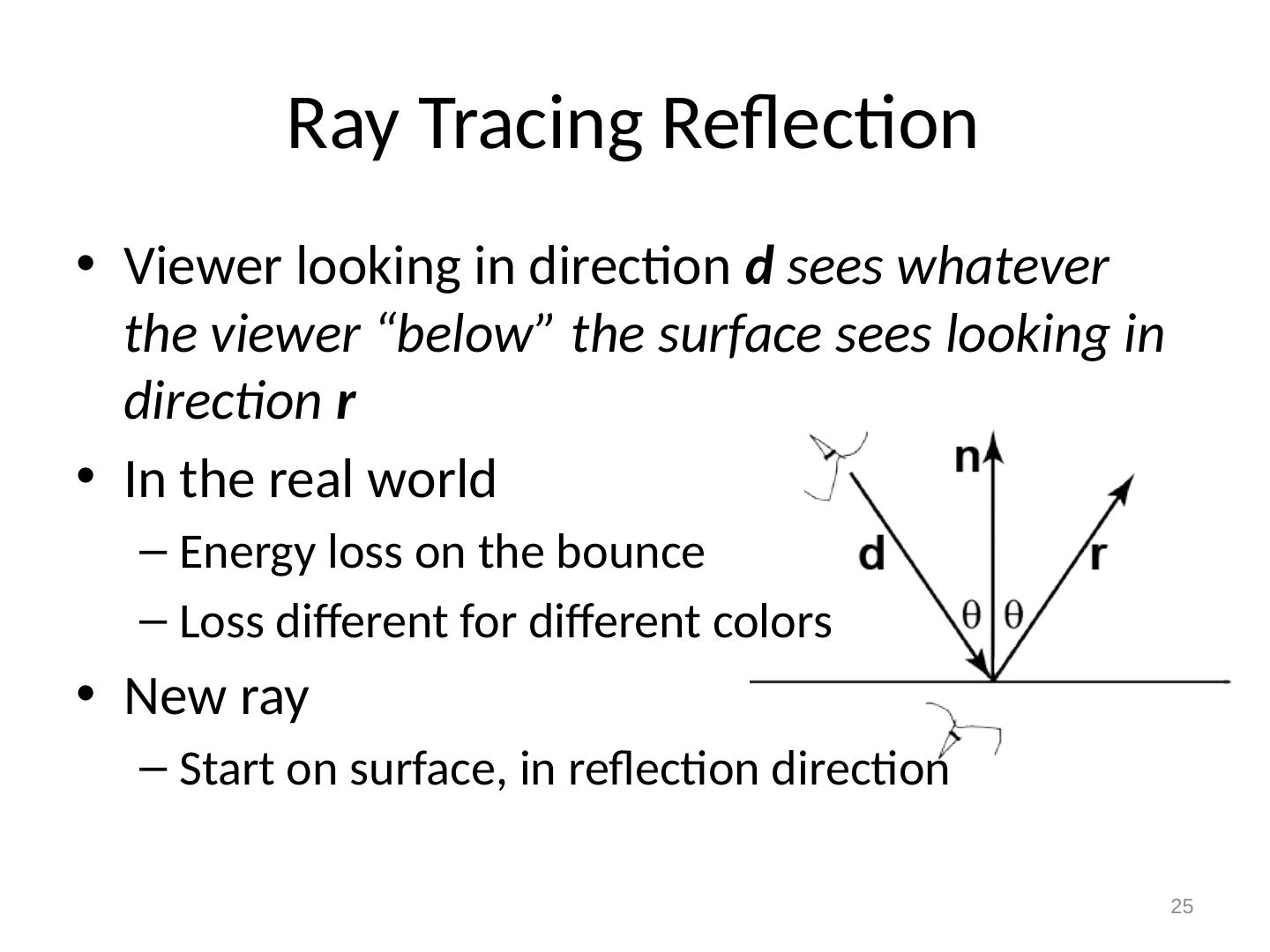 25 .25 Ray Tracing Reflection Viewer looking in direction d sees whatever the viewer “below” the surface sees looking in direction r In the real world Energy loss on the bounce Loss different for different colors New ray Start on surface, in reflection direction