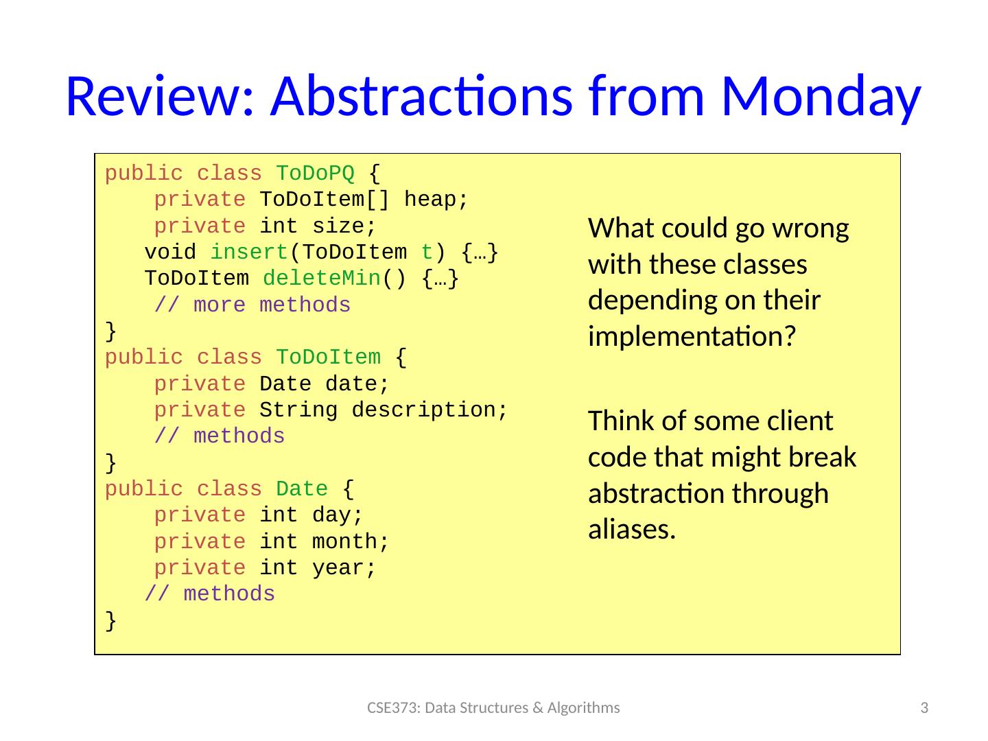 3 .Review: Abstractions from Monday 3 CSE373: Data Structures & Algorithms public class ToDoPQ { private ToDoItem [] heap; private int size; void insert ( ToDoItem t ) {…} ToDoItem deleteMin () {…} / / more methods } public class ToDoItem { private Date date; private String description; / / methods } public class Date { private int day; private int month ; private int year; / / methods } What could go wrong with these classes depending on their implementation? Think of some client code that might break abstraction through aliases.