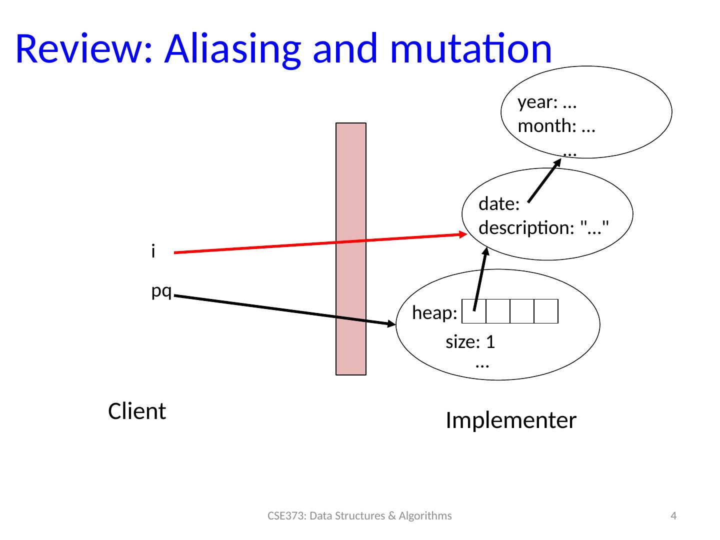 4 .Review: Aliasing and mutation 4 CSE373: Data Structures & Algorithms pq h eap: size: 1 … date: d escription: "…" year: … month: … … i Client Implementer