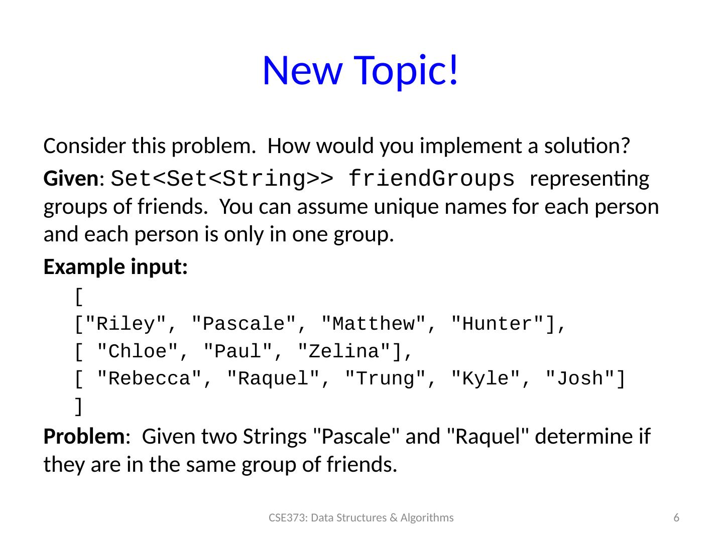 6 .New Topic! C onsider this problem. How would you implement a solution ? Given : Set<Set<String>> friendGroups representing groups of friends. You can assume unique names for each person and each person is only in one group. Example input: [ ["Riley", "Pascale", "Matthew", "Hunter"], [ "Chloe", "Paul", " Zelina "], [ "Rebecca", "Raquel", " Trung ", "Kyle", "Josh"] ] Problem : Given two Strings "Pascale" and "Raquel" determine if they are in the same group of friends. 6 CSE373: Data Structures & Algorithms