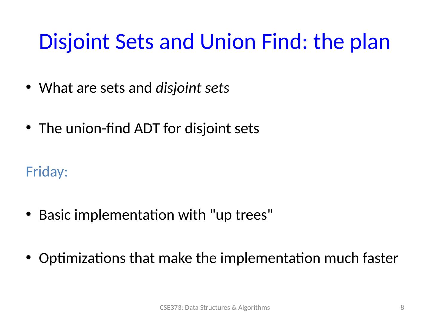 8 .Disjoint Sets and Union Find: the plan What are sets and disjoint sets The union-find ADT for disjoint sets Friday: Basic implementation with "up trees" Optimizations that make the implementation much faster 8 CSE373: Data Structures & Algorithms