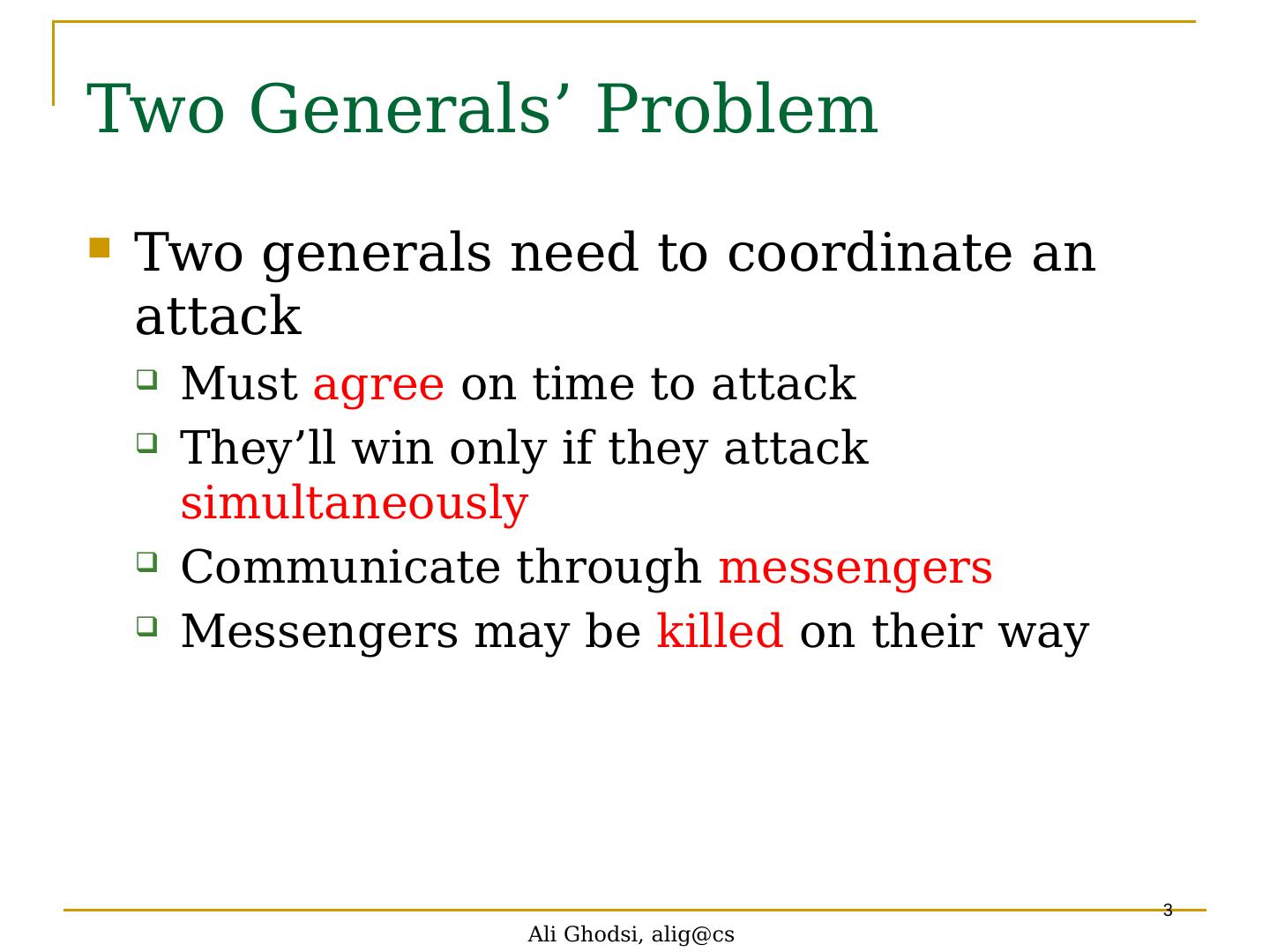 3 .Ali Ghodsi, alig@cs 3 Two Generals ’ Problem Two generals need to coordinate an attack Must agree on time to attack They ’ ll win only if they attack simultaneously Communicate through messengers Messengers may be killed on their way