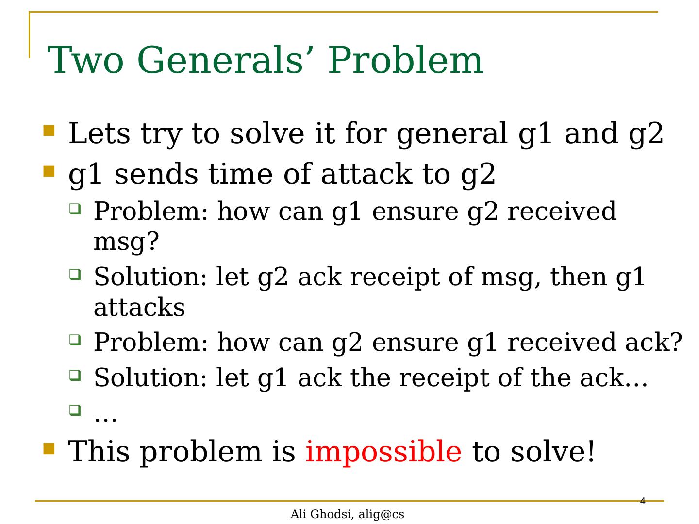 4 .Ali Ghodsi, alig@cs 4 Two Generals ’ Problem Lets try to solve it for general g1 and g2 g1 sends time of attack to g2 Problem: how can g1 ensure g2 received msg ? Solution: let g2 ack receipt of msg , then g1 attacks Problem: how can g2 ensure g1 received ack ? Solution: let g1 ack the receipt of the ack … … This problem is impossible to solve!