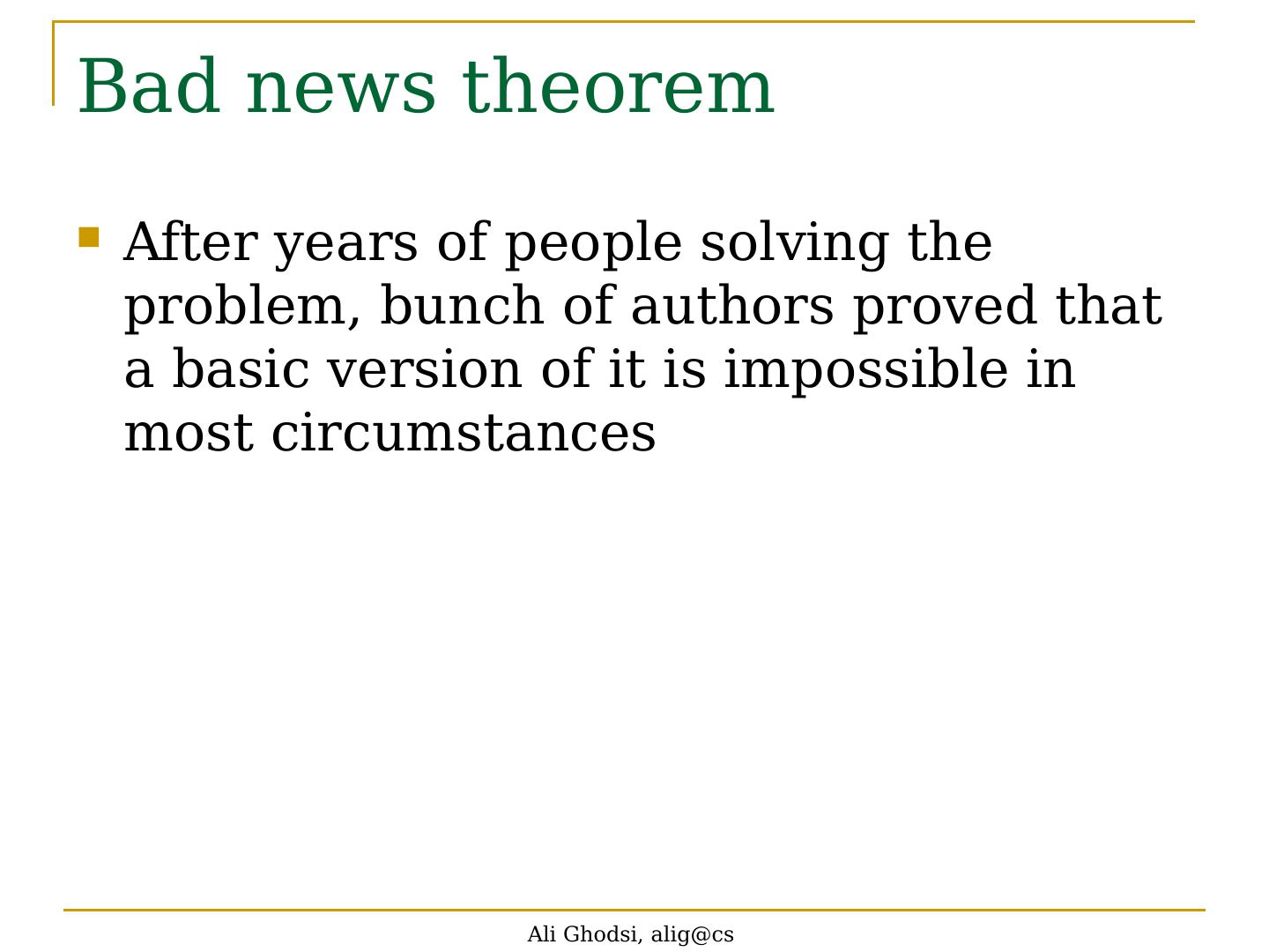 7 .Bad news theorem After years of people solving the problem, bunch of authors proved that a basic version of it is impossible in most circumstances Ali Ghodsi, alig@cs