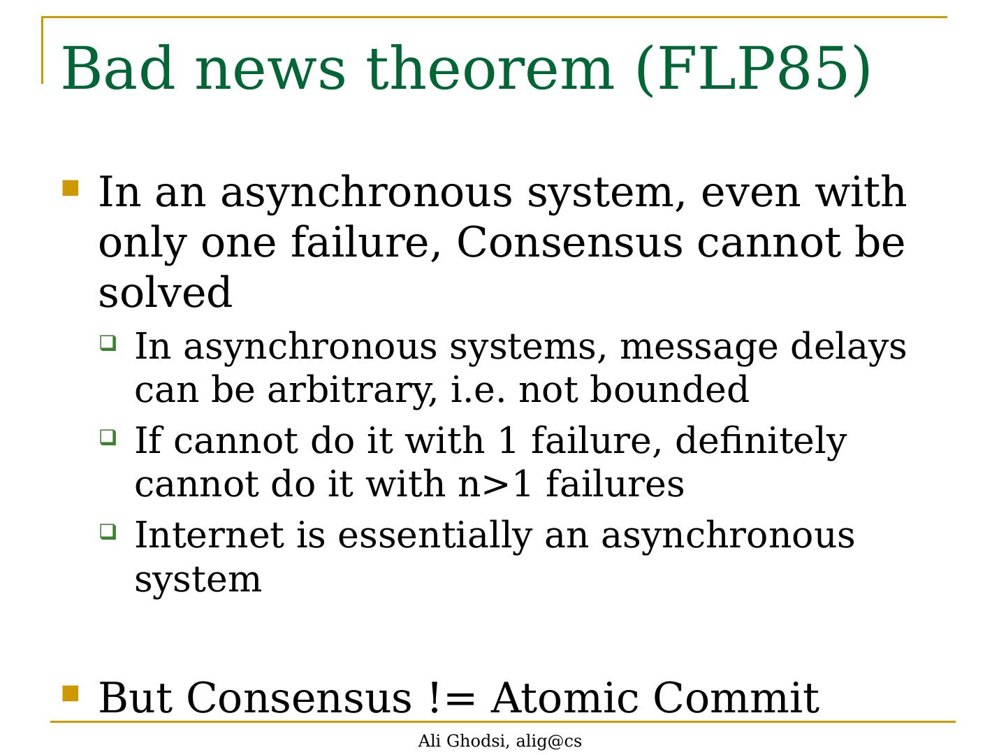 9 .Bad news theorem (FLP85) In an asynchronous system, even with only one failure, Consensus cannot be solved In asynchronous systems, message delays can be arbitrary, i.e. not bounded If cannot do it with 1 failure, definitely cannot do it with n>1 failures Internet is essentially an asynchronous system But Consensus != Atomic Commit Ali Ghodsi, alig@cs