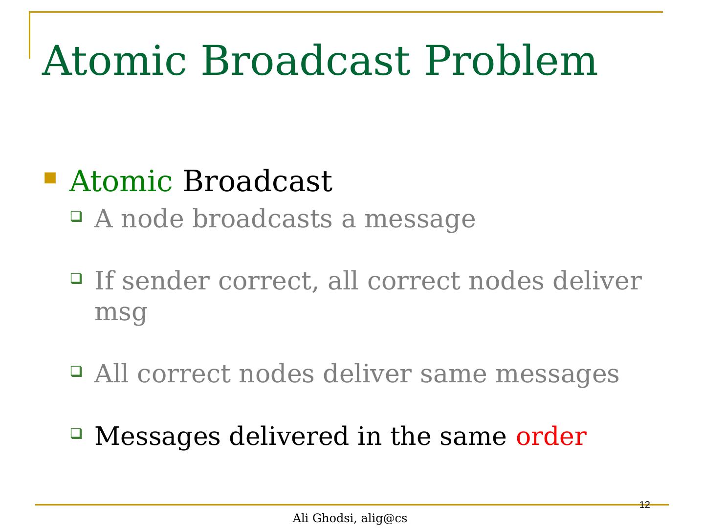 12 .Ali Ghodsi, alig@cs 12 Atomic Broadcast Problem Atomic Broadcast A node broadcasts a message If sender correct, all correct nodes deliver msg All correct nodes deliver same messages Messages delivered in the same order