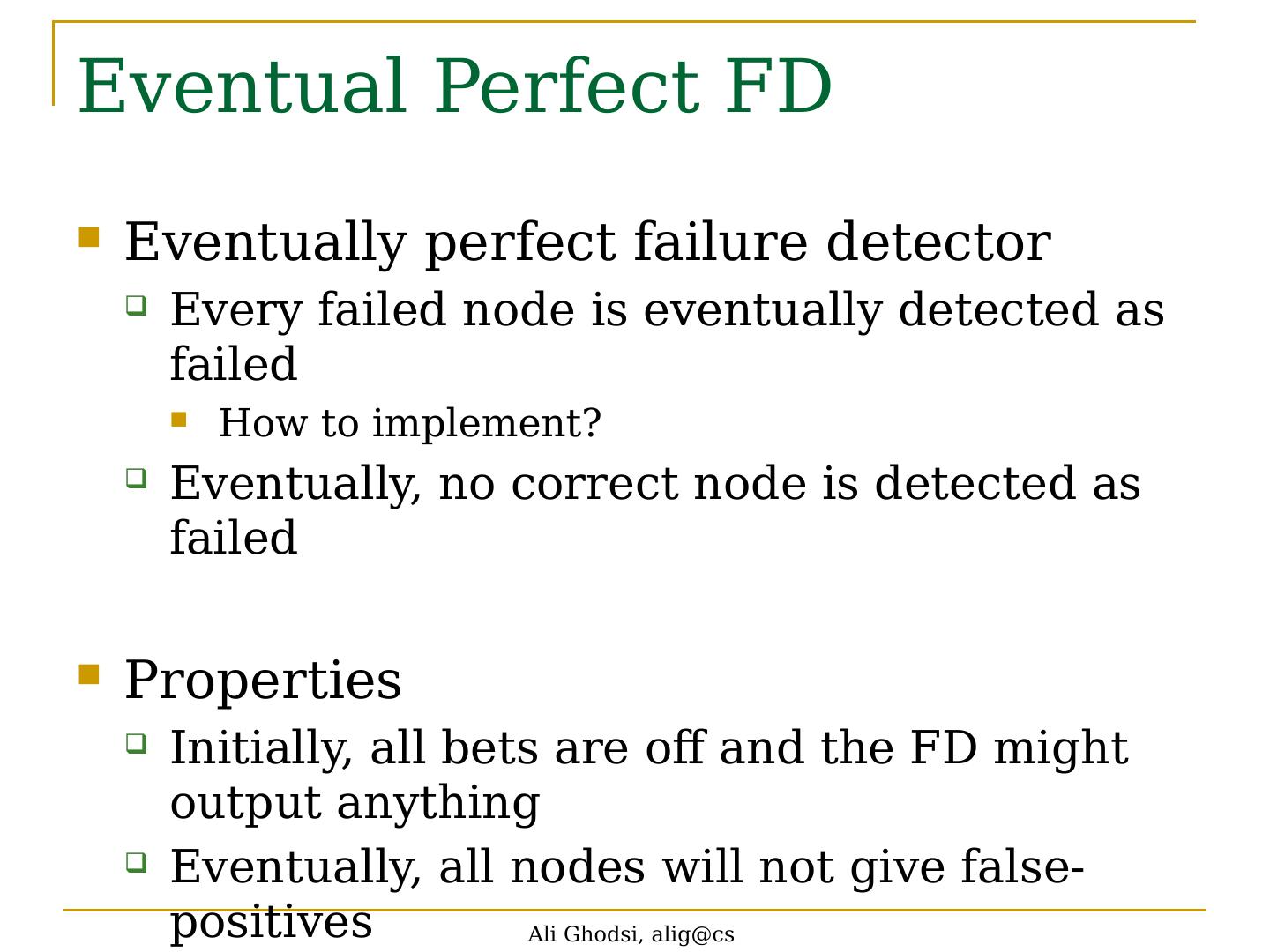 18 .Eventual Perfect FD Eventually perfect failure detector Every failed node is eventually detected as failed How to implement? Eventually, no correct node is detected as failed Properties Initially, all bets are off and the FD might output anything Eventually, all nodes will not give false-positives Ali Ghodsi, alig@cs