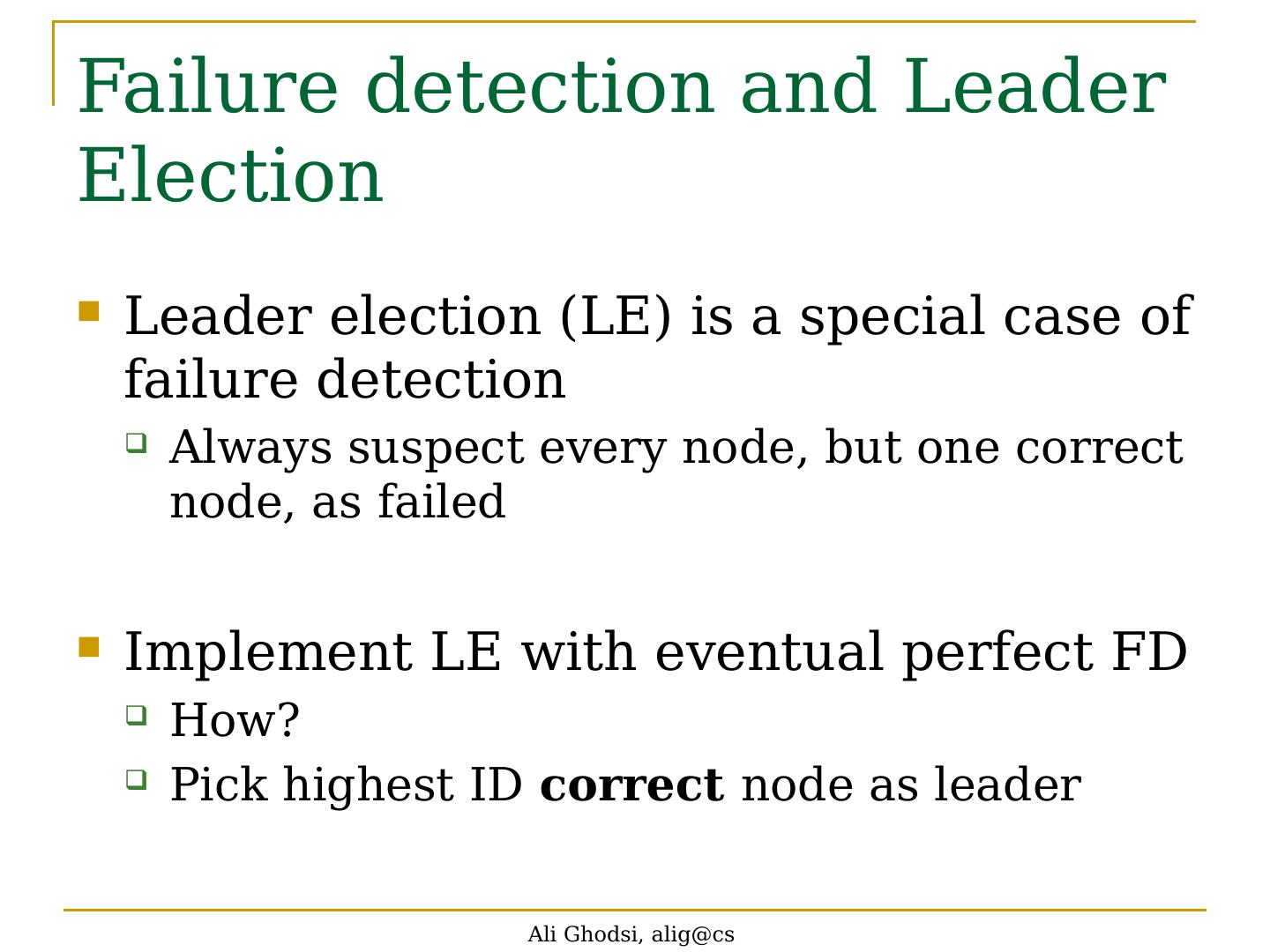 19 .Failure detection and Leader Election Leader election (LE) is a special case of failure detection Always suspect every node, but one correct node, as failed Implement LE with eventual perfect FD How? Pick highest ID correct node as leader Ali Ghodsi, alig@cs